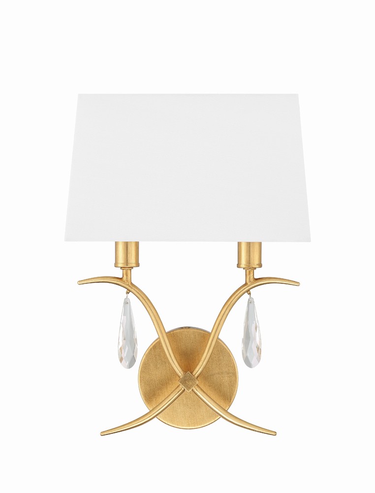 Rollins wall mount is a classic design versatile to fit traditional and modern settings. A tapered rectangular silk shade beautifully contrasts its Antique Gold finish. The organic inner metal frame features swopping arms and elongated crystal drops. This elegant collection provides an elevated and timeless look to an interior setting.