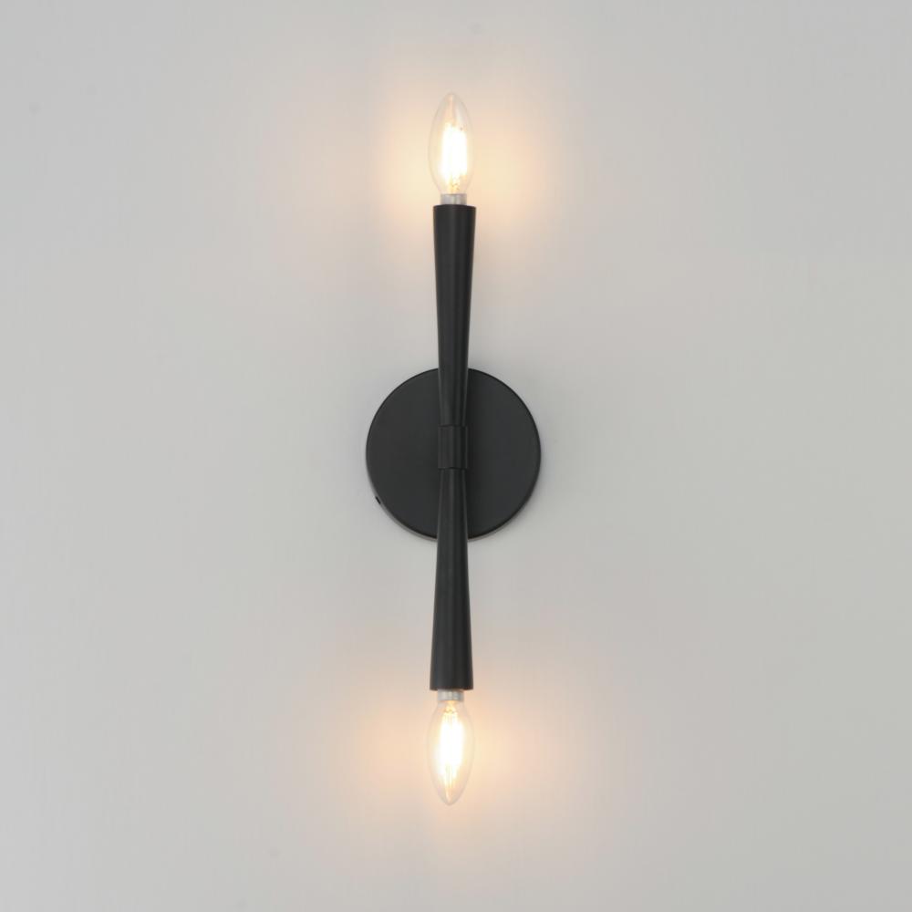Civic styling using straight rectilinear channels radiating from a central connector. The light sources flare out both up and down with tapered candle covers creating a form evocative of a classic torch. Available in matte Black, Satin Brass, and Satin Nic
