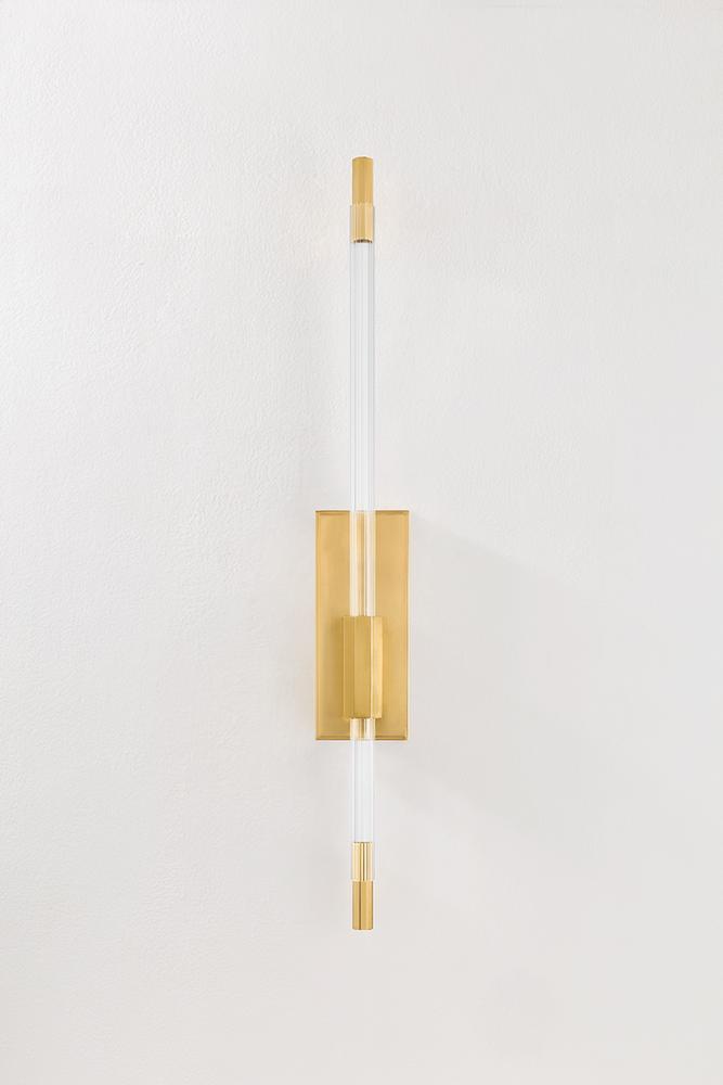 Clean lines, transparent layers, and sleek metalwork define this modern sconce. Exploring an innovative lighting technique, Rosco features a thin edge-lit acrylic rod inside an extruded glass tube. Creating a remarkably slim overall silhouette, this double-layer of diffusion emits a warm light output. Designed as a bath sconce, Rosco is finished with classic Aged Brass hardware.