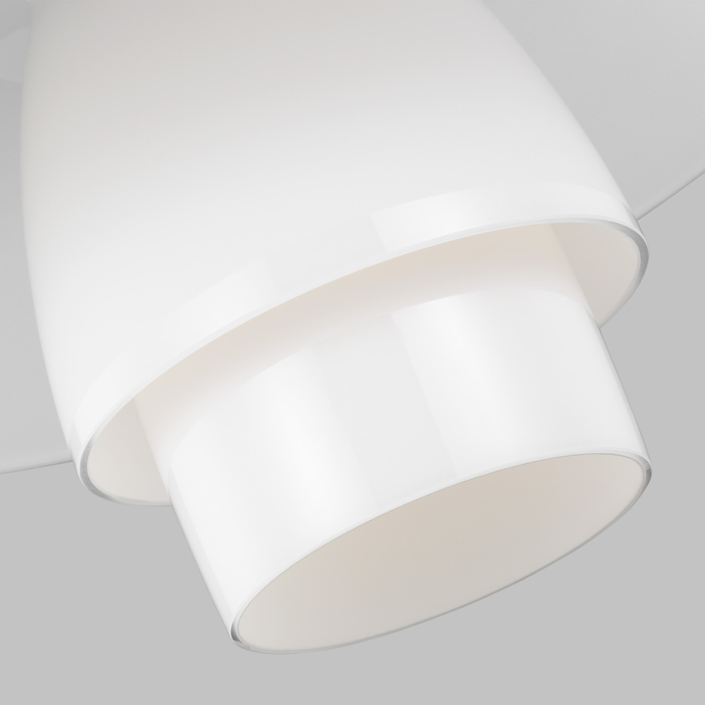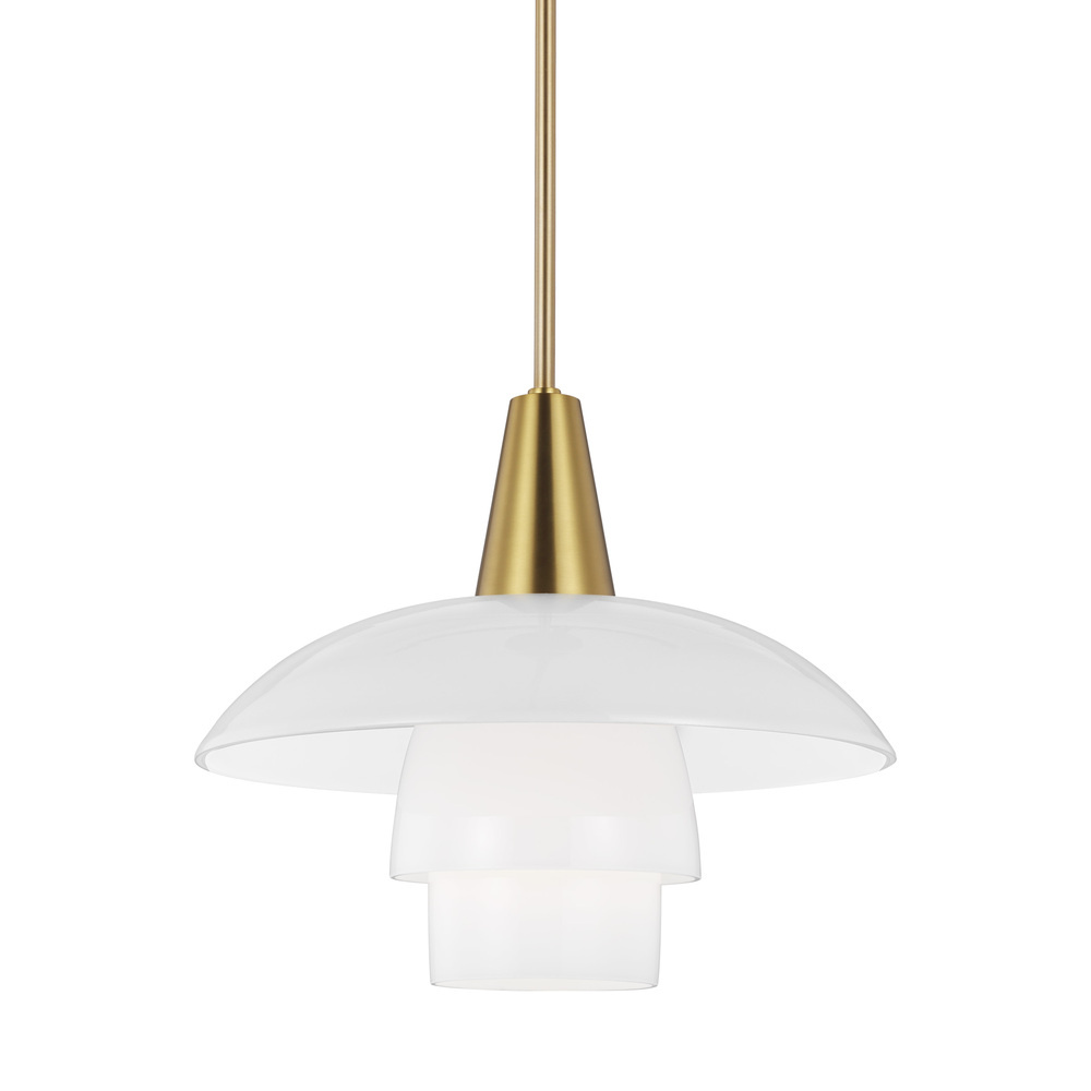 The Rossie one light indoor pendant in Burnished Brass from Ellen DeGeneres features hand blown stacked individual layered milk glass shade, creating a sleek look that is both stylish and functional. The table lamp has a metal cascading shade with its light source completely invisible, because it is hidden within the shade. The light is diffused through the opal glass lampshades, which are arranged in a logarithmic spiral.