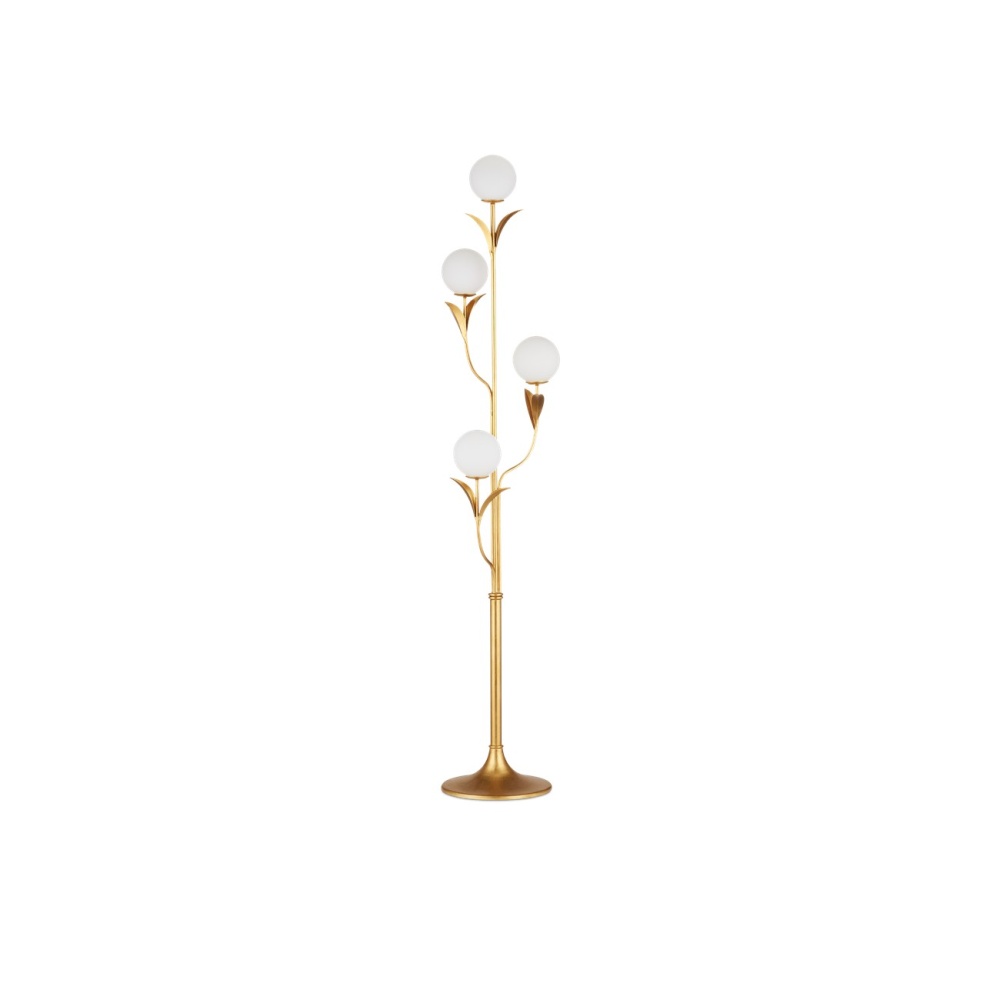 The Rossville Floor Lamp exudes a contemporary retro vibe with its globe-shaped bulbs. This nature-inspired floor lamps is modern in its makeup with the thin arcing leaves that flow along the body and stem of each of the four lights. Made of wrought iron in a contemporary gold leaf finish, the bobeches balance their white glass globes brilliantly.