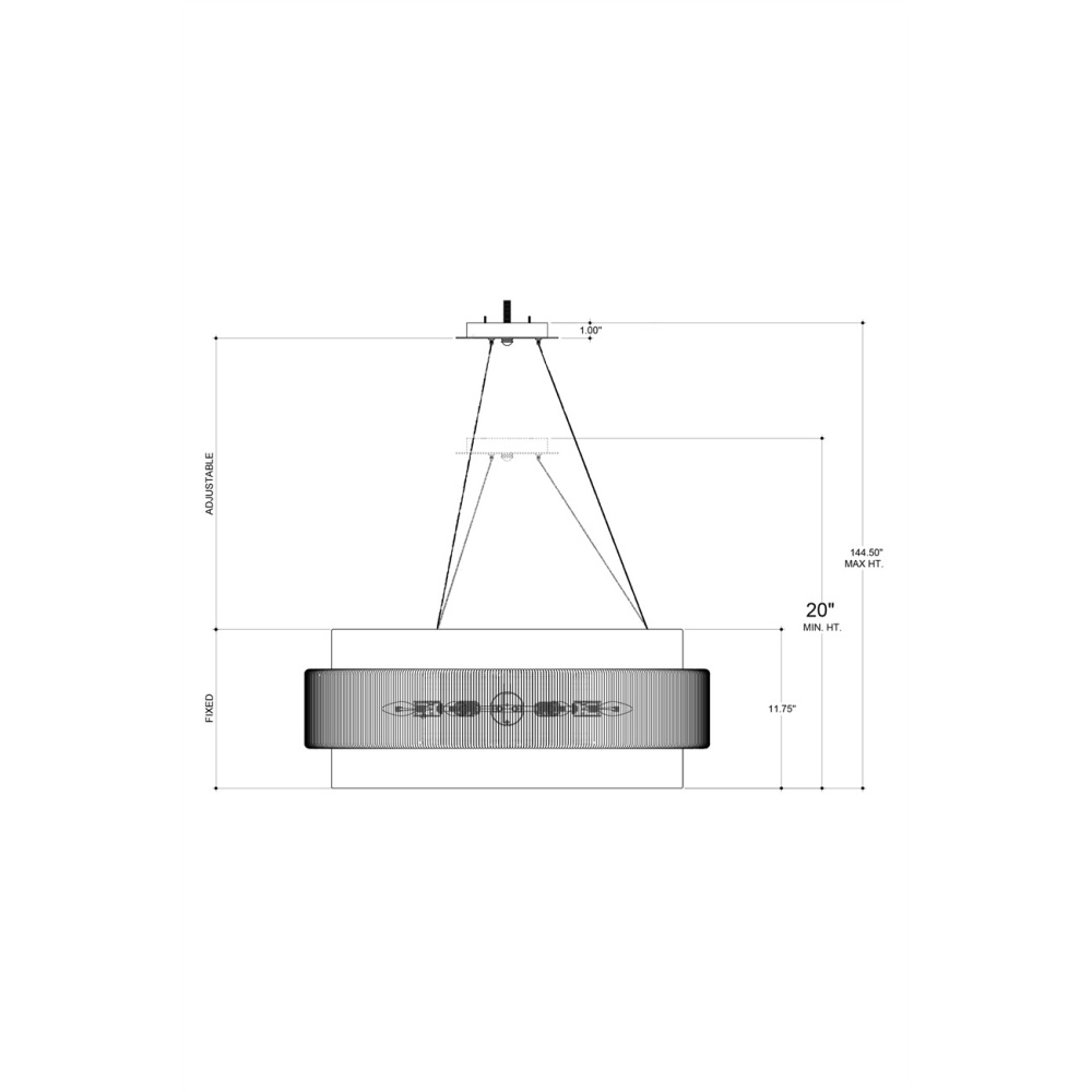 Our Rousham Chandelier has an unusual accent on its fabric shade created by the twine panel made from recycled paper that is twisted and tightly wrapped around a metal frame. The panel made from the sustainable material, which is affixed to the center of the shade, is then coated with a sealant to protect it from moisture. The beige chandelier is suspended with aircraft cable and has a sugar white finish on the interior of the shade, which brightens the light. Adjustable from 20" to 144.5" with use of included chain/rod kit/cable. If your space calls for a longer drop, additional chain/rods/cable is available for purchase.