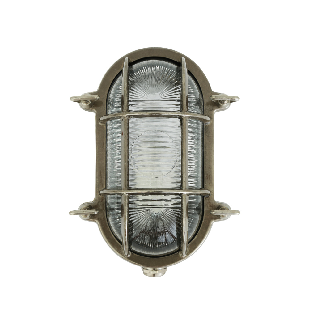 Ruben Small Oval Marine Wall Sconce ñ Compact Nautical Charm with Industrial Durability The Ruben Small Oval Marine Wall Sconce blends rugged practicality with marine-inspired style, perfect for a variety of indoor and outdoor spaces. Crafted from solid brass, it features a prismatic glass lens protected by a sturdy brass cage. The textured glass creates a captivating light effect, adding depth and character to your space. Its oval shape and secure clasp fastenings highlight its nautical heritage while ensuring lasting durability and function. Ideal for porches, hallways, or bathrooms, the Ruben wall sconce brings timeless maritime charm to your home or commercial setting.