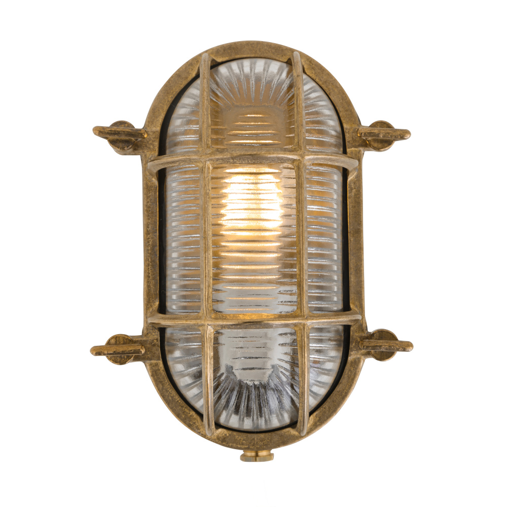 Ruben Small Oval Marine Wall Sconce ñ Compact Nautical Charm with Industrial Durability The Ruben Small Oval Marine Wall Sconce blends rugged practicality with marine-inspired style, perfect for a variety of indoor and outdoor spaces. Crafted from solid brass, it features a prismatic glass lens protected by a sturdy brass cage. The textured glass creates a captivating light effect, adding depth and character to your space. Its oval shape and secure clasp fastenings highlight its nautical heritage while ensuring lasting durability and function. Ideal for porches, hallways, or bathrooms, the Ruben wall sconce brings timeless maritime charm to your home or commercial setting.