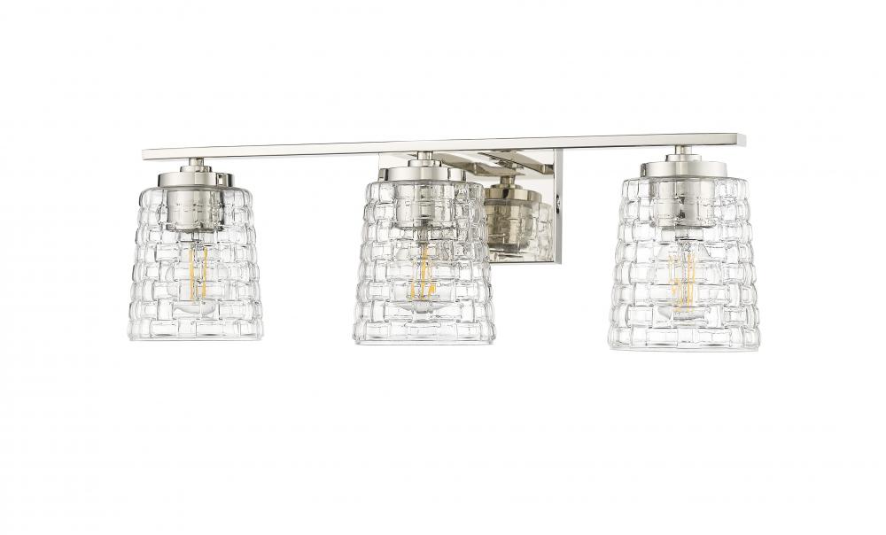 The Saben Collection of vanity and pendant lighting is pure glamour, perfect for any interior scheme from transitional modern to Art Deco. The basket-weave textured, clear glass shades create a crystal-like effect against the sleek, understated lines of the elegant fixtures, which are available in matte black, modern gold, polished nickel, brushed nickel or vintage brass. The overall result is a playful and sparking display of light.