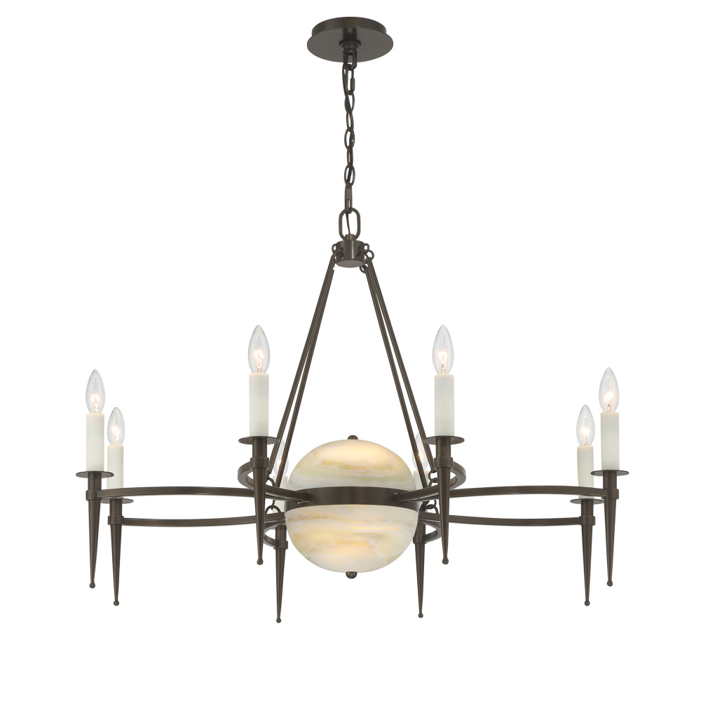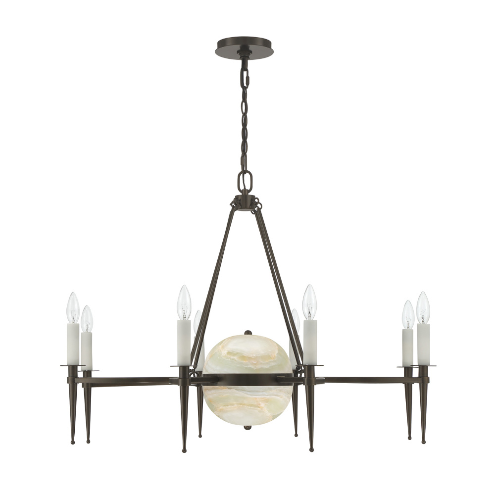 The Savoy House Sanger 10-light chandelier was designed by Dann Foley, an award-winning interior designer celebrated for impeccable style, taste and quality. This dramatic design features two layers of illumination: eight lights topping elegantly pointed, sweeping arms, plus an LED downlight that gleams from within an orb of natural onyx. The Mediterranean Bronze finish enriches the warm, organic beauty of the stone. Sanger is 25.88" in height and 37" in width. It uses ten candelabra size bulbs of up to 60 watts per bulb. Bulbs not included. Comes with 120" of chain.
