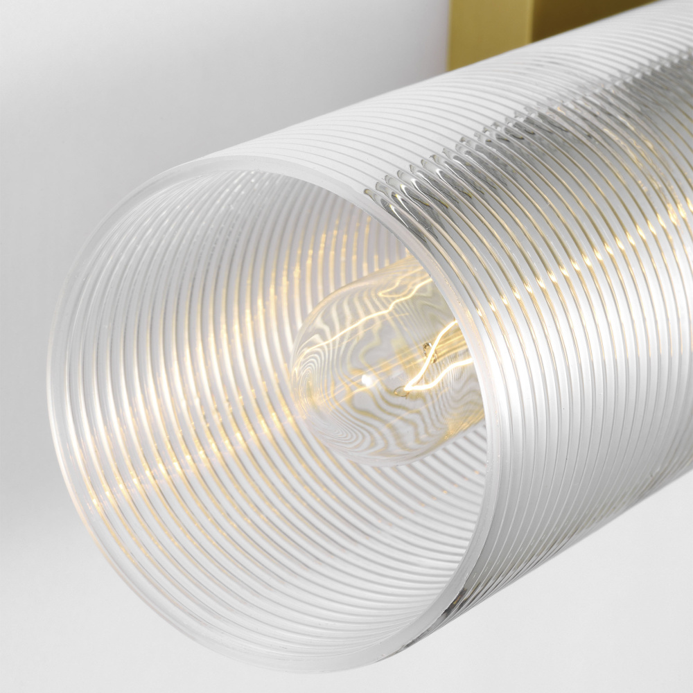 Crafted with Steel in a Satin Brass finish with clear ribbed glass shades