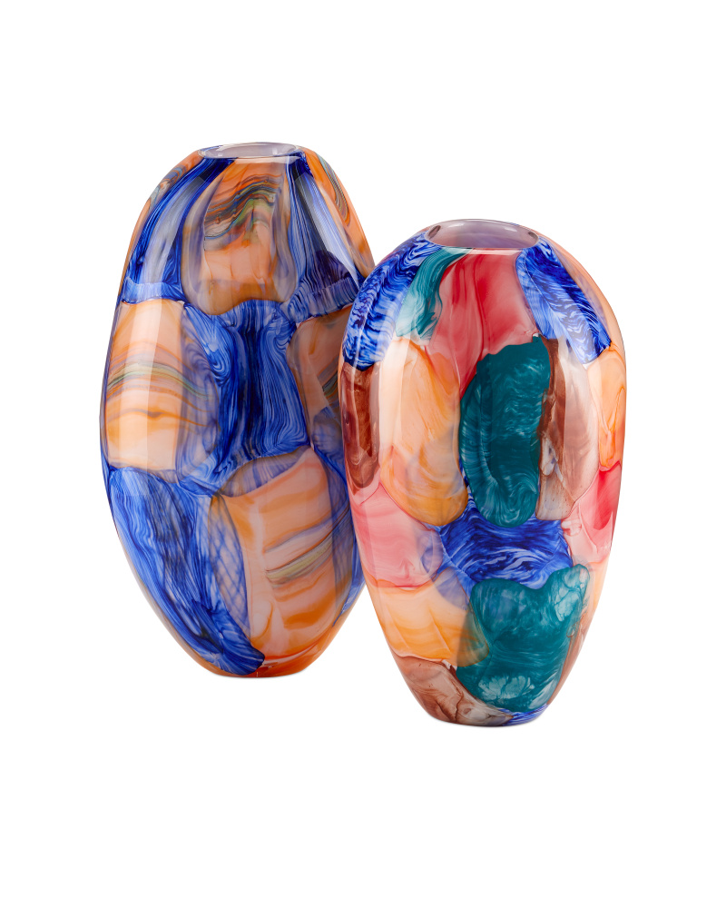 The Sarto Glass Vase is an extremely heavy work of art that is hard-won by glass-blowers because the thickness of the glass makes it challenging for the lungs. The multicolored vase can only be accomplished when two glass artisans work in concert: as the glass blower is slowly creating the shape of the vase, the other artisan is "painting" textural swirls onto its surface. As he or she does so, the glass increases in thickness. The duo must work quickly in order to be successful with this incredible profile and its color palette, each of which will be unique.