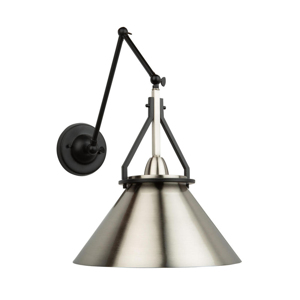 This model from the "Brydon Collection" features a metal semi gloss nickel shade with black arms and canopy. This design is industrial looking and has multiple hinges for adjustability. This model can be a wall bracket or straight rod pendant (extra 12" rod included for height if needed). If hanging as a wall sconce you can adjust the height and extension to your desired position.