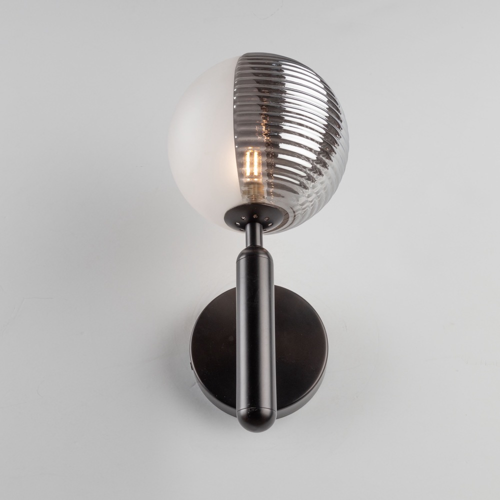 The Bolla Collection radiates unique allure through its innovative design, seamlessly combining half-acid white and half-ribbed smoke glass spheres. The chandelier's interplay of textures and tones establishes a visually striking focal point, effortlessly merging contemporary aesthetics with enduring charm. This unique glassware is complimented with a semi gloss black frame. Single light wall sconce shown.