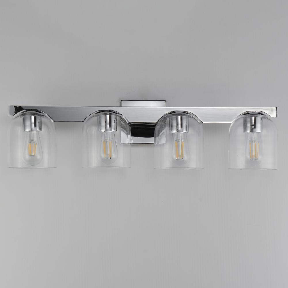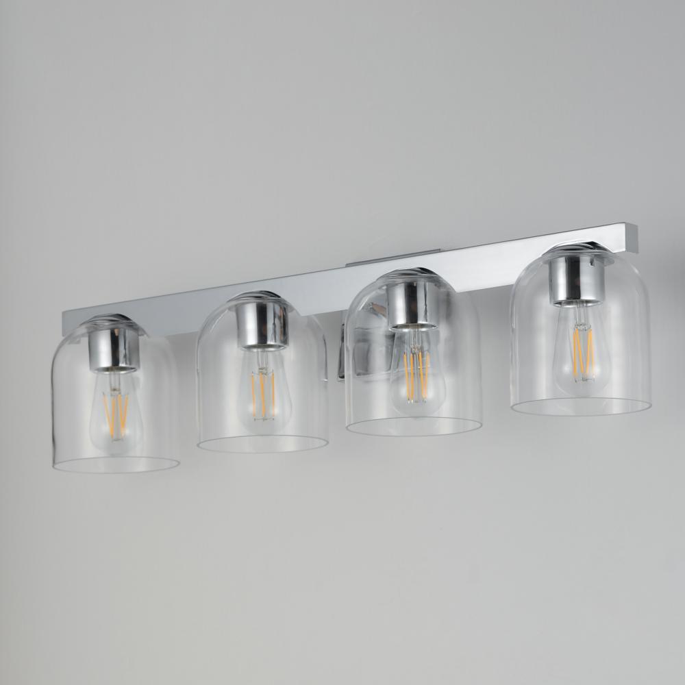 Cut-out metalwork curves around modern bell-shaped glass shades. The series includes pendants and bath vanities available in either Clear or a swirling Marble glass. Available in various complementary finishes: Polished Chrome, Matte Black, or Natural Aged
