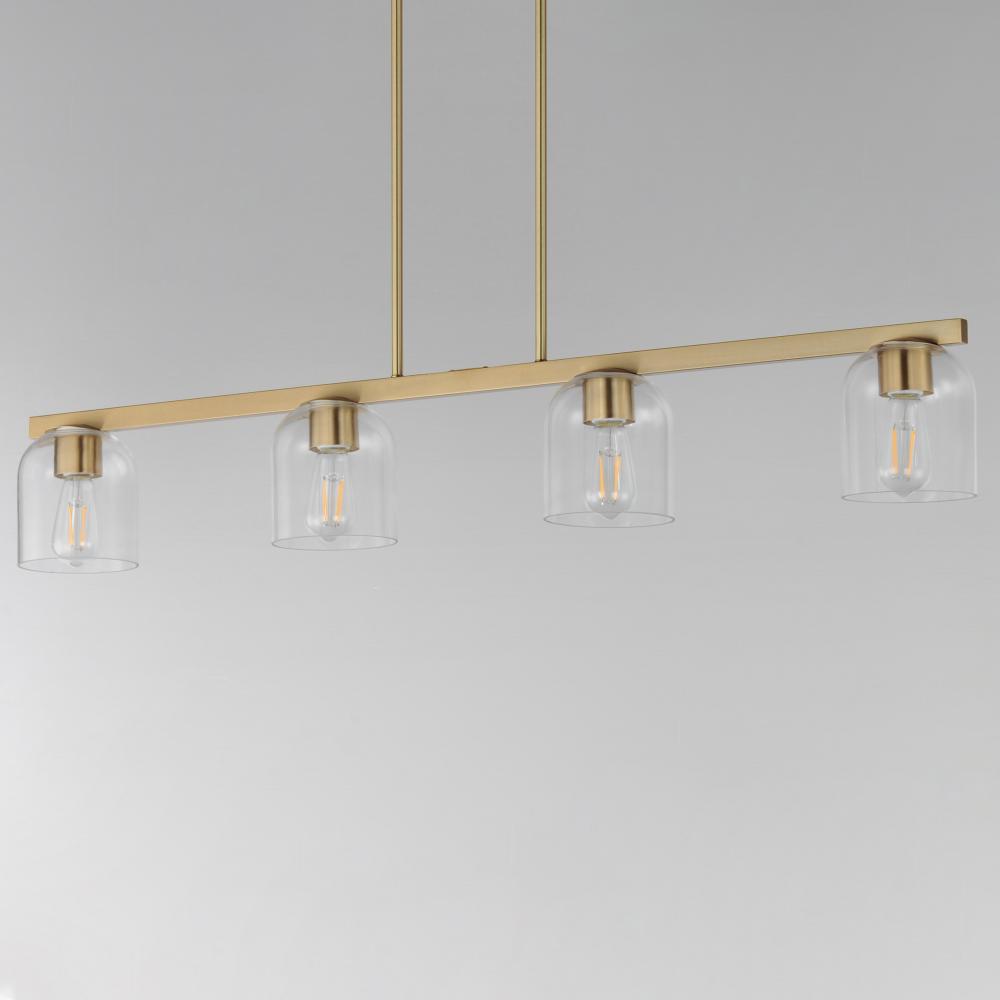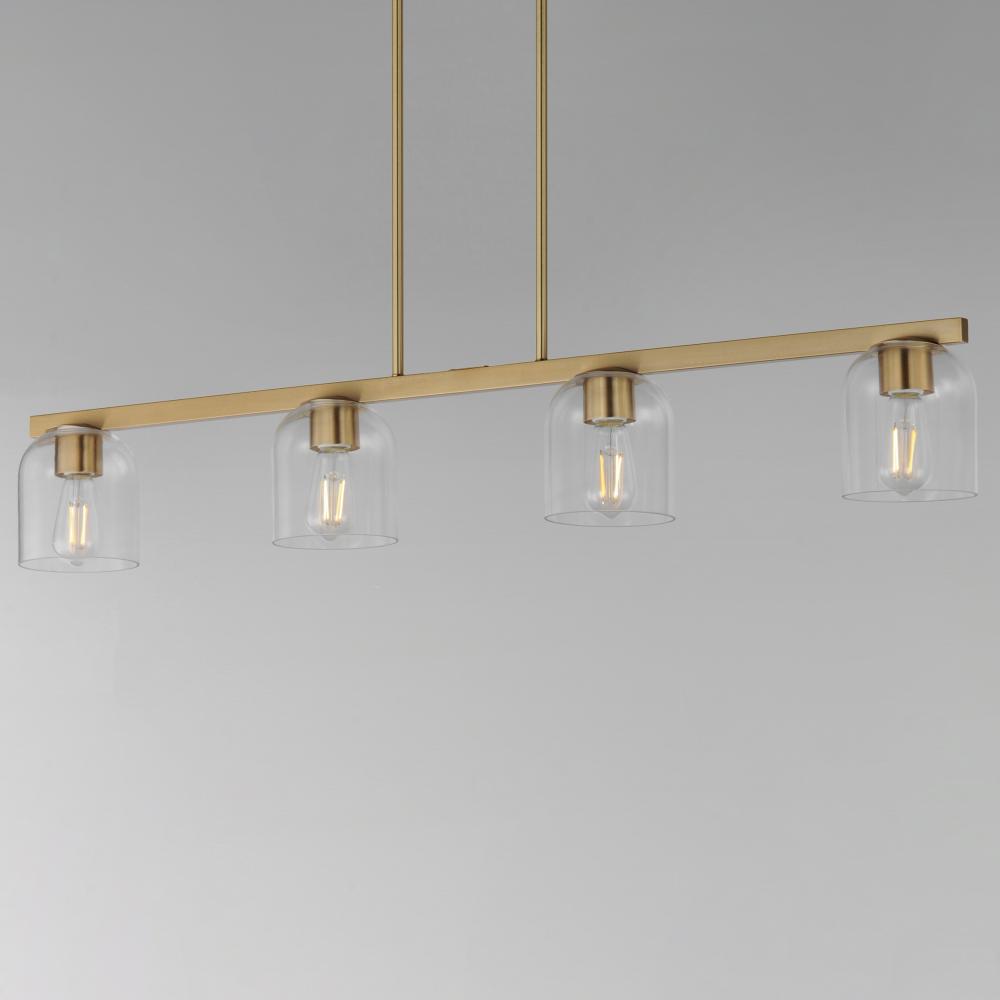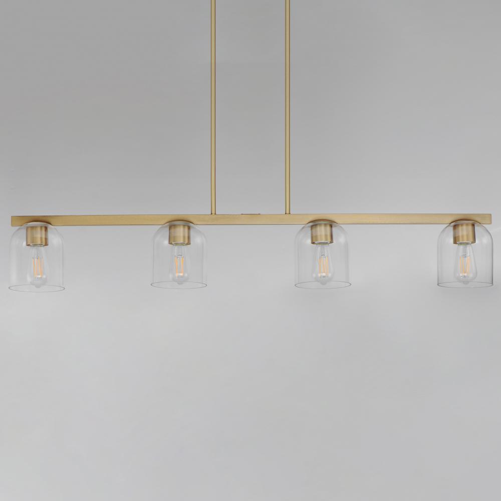 Cut-out metalwork curves around modern bell-shaped glass shades. The series includes pendants and bath vanities available in either Clear or a swirling Marble glass. Available in various complementary finishes: Polished Chrome, Matte Black, or Natural Aged