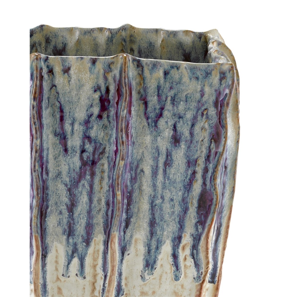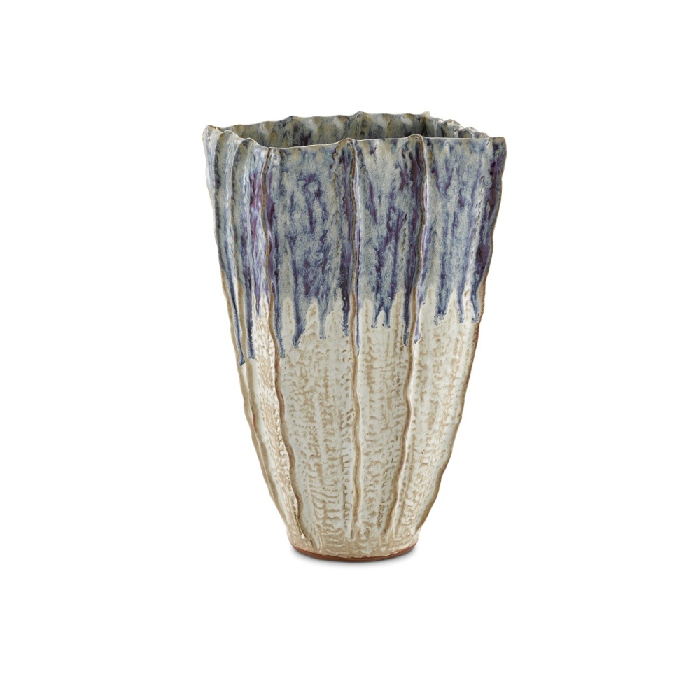 The Sea Horizon Large Vase is an ivory vase onto which blue and purple glazes have been dripped. The main finish is a milky white hue with a tinge of cream to it. One of the unique characteristics of its fluted shape is how the ridges that jut out from the surface look as if they have been pinched in place.