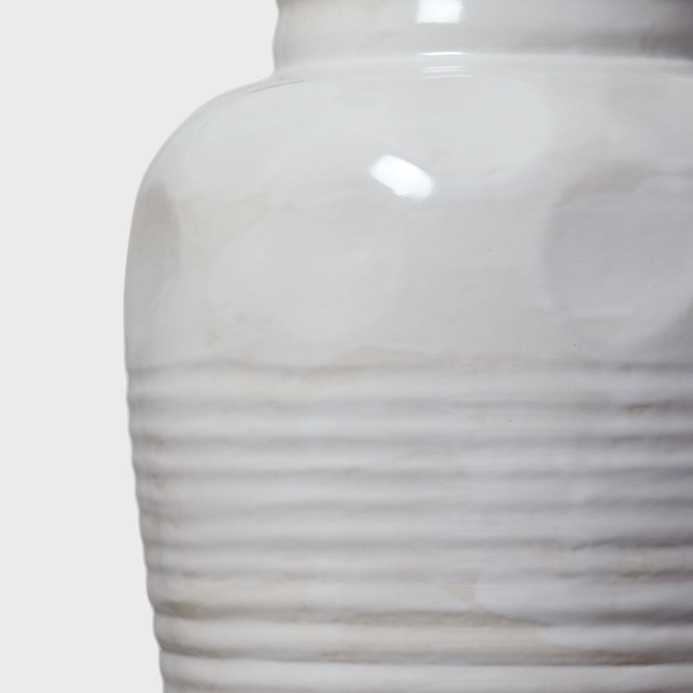 Features a canister jar silhouette enhanced with subtle ribs and round impressions, creating depth and tactile appeal.