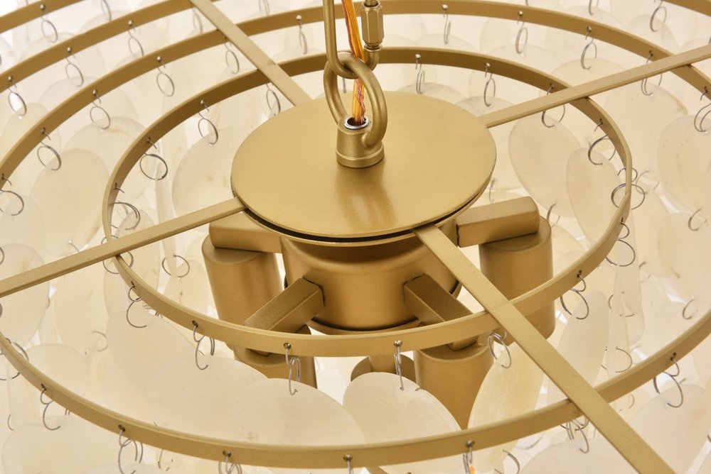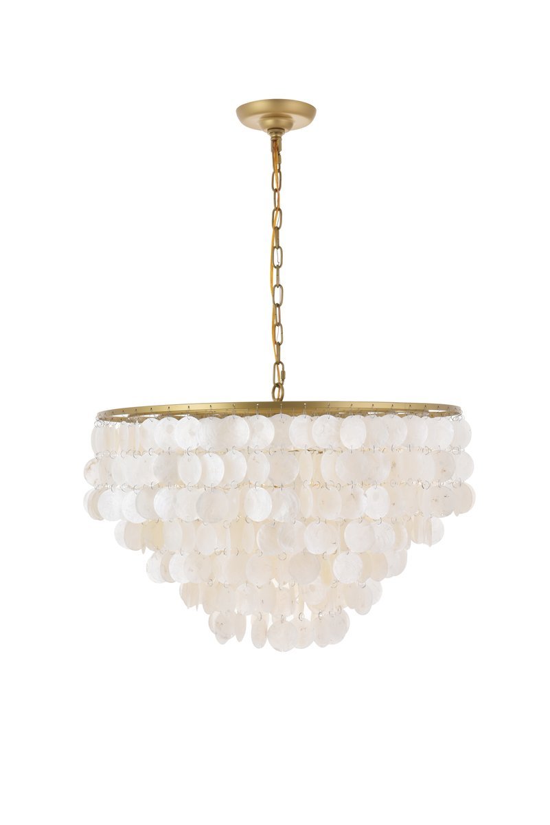 The gentleness of the Selene collection pendant lamp in a brass finish elicits the calm temperament of the moon and the coy-- yet soothing, light it emits. Weaving through the myriad of the draped shell curtains, the illumination creates a new design every time, whether it is the shadows and highlights that changes with the direction of the light, just as the moon goes through its phases, or the shadows casted with every slight movement of the white shells. A wonderful addition to any home--foyer, living room, or a child's room.