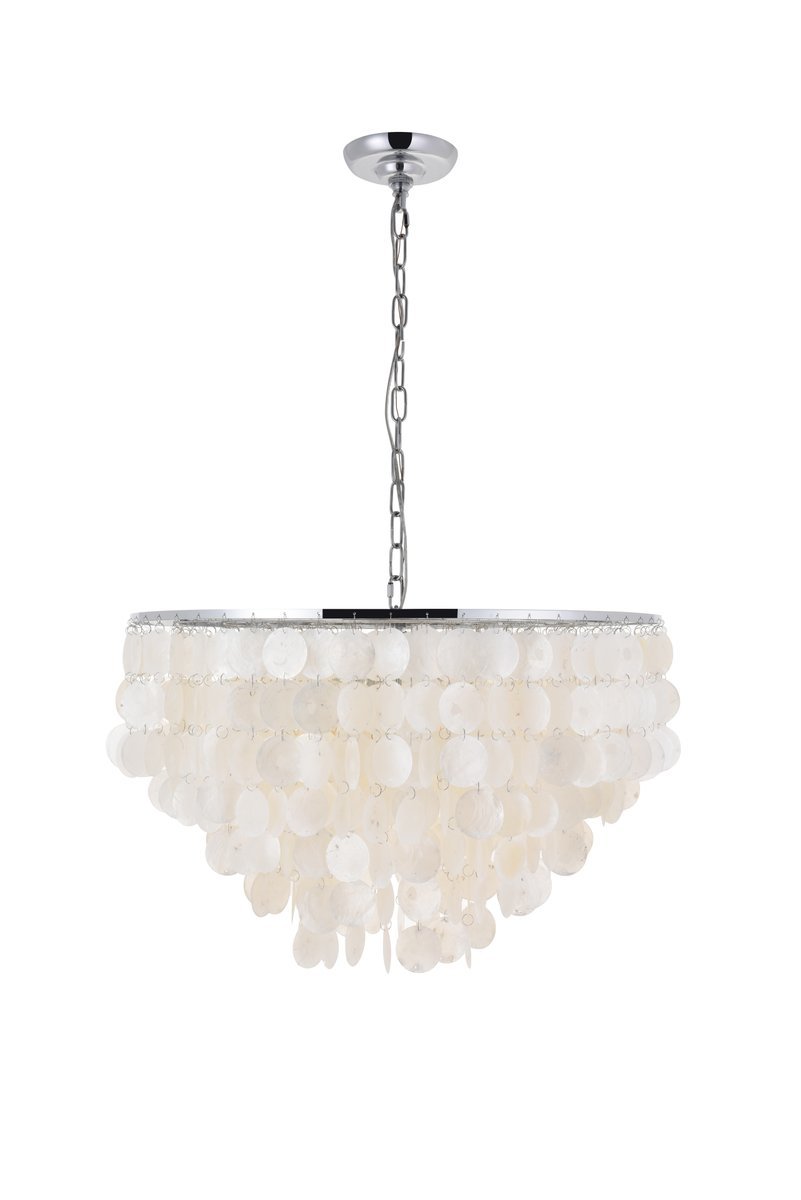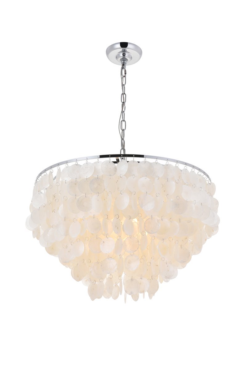 Chrome finish pendant with dreamy off-white shells adorning the tiers