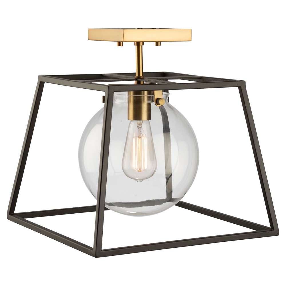 The "Bridgetown" collection semi flush mount features a clean and transitional design. The outer frame is a black tapper square while the interior is plated in a rich harvest brass. The glassware is clear and circular.