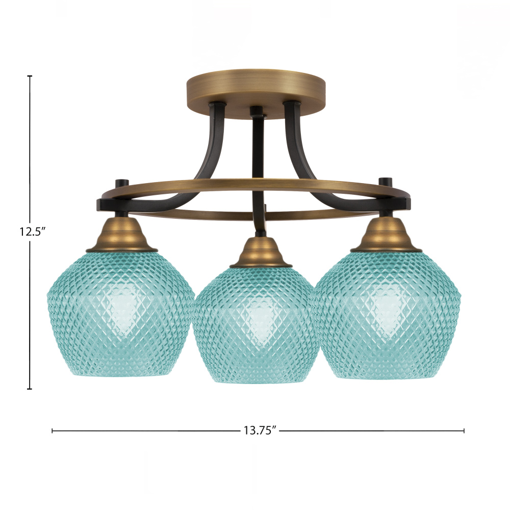 Paramount 3 Light Semi Flush Shown In Matte Black & Brass Nickel Finish With 6 Turquoise Textured Glass