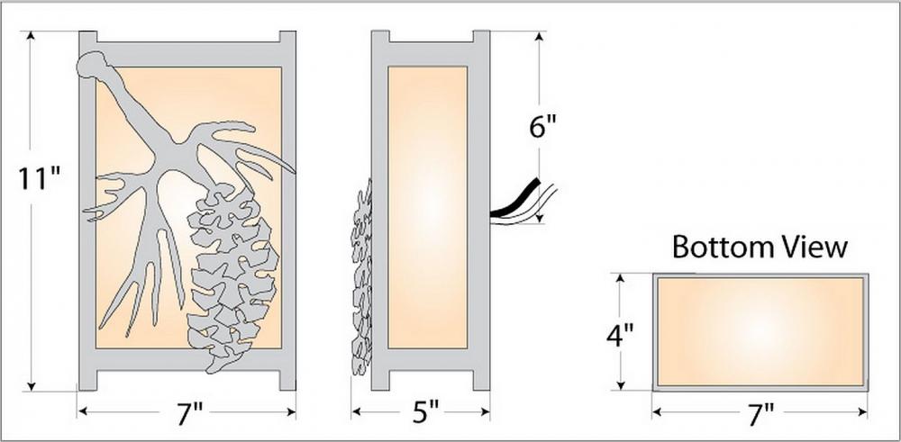 Log Cabin style Interior Wall Sconces handmade in USA by Avalanche Ranch Lighting. This light features our exclusive metal wildlife art of a Pine Cone. This Wall Light is ideal for anyone looking to add rustic character or unique log home lighting to their home. Dimensions (inches): 11h x 7w and Takes 2 - Type B11 bulbs - 60W max. each