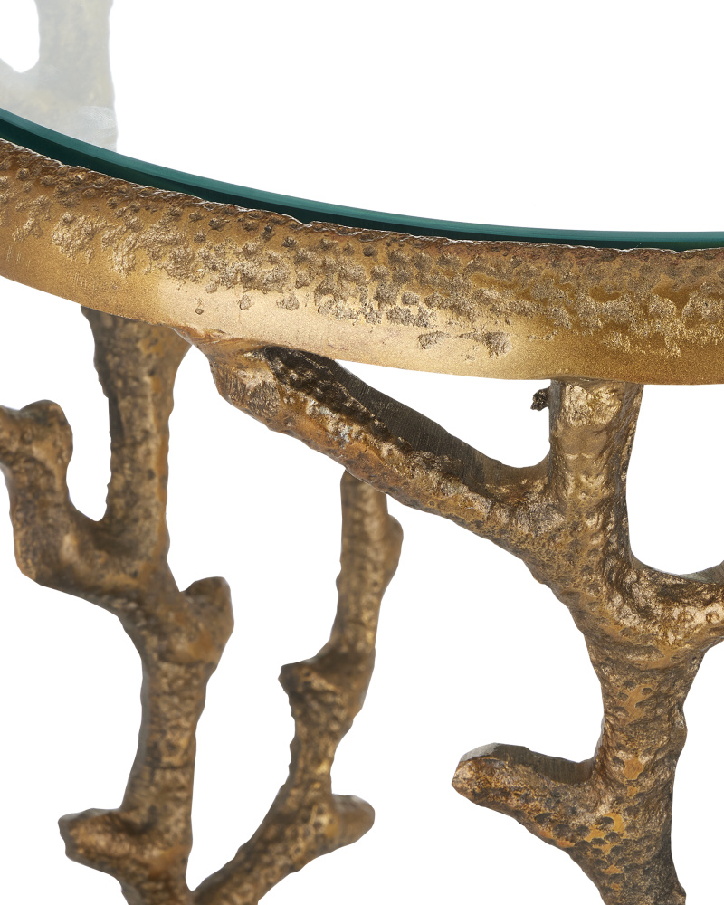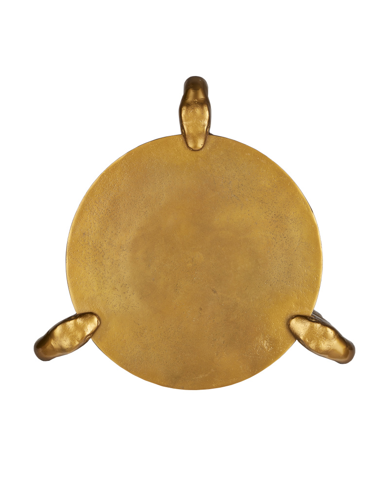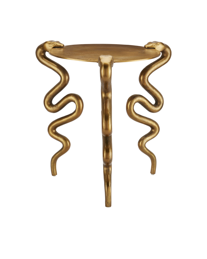 Supporting the disc top of the Serpent Brass Accent Table are curvy creatures that pull a balancing act as they clamp down on its thin surface. This is a whimsical aspect of this design. Made of cast aluminum in an antique brass finish, the gleaming gold occasional table will certainly be a conversation starter in any space, as it will command attention when the luminous surfaces glow when light touches them. Illustrating the artisanal aspects of cast aluminum, there are drifts of patina throughout the profile.