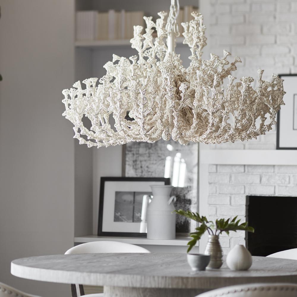 Fully beaded with tiny coco beads in a soft white finish. Chandelier is complete with an off-white finished chain and canopy for hanging kit. Professional installation recommended.
