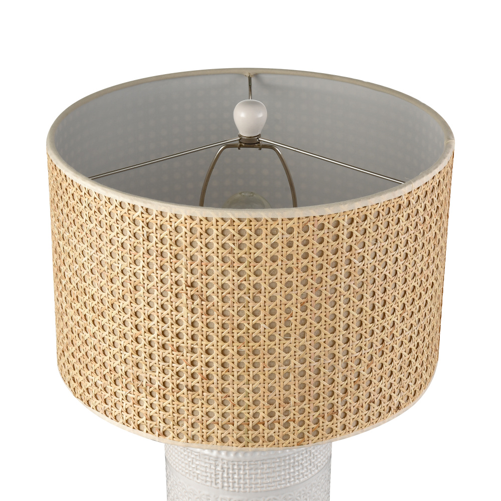 The Seymour Table Lamp showcases a textured cylindrical ceramic body with a white glaze and embossed pattern. A natural cane-style wrapped rattan drum shade adds warm color and textural contrast to this coastal-inspired lamp.