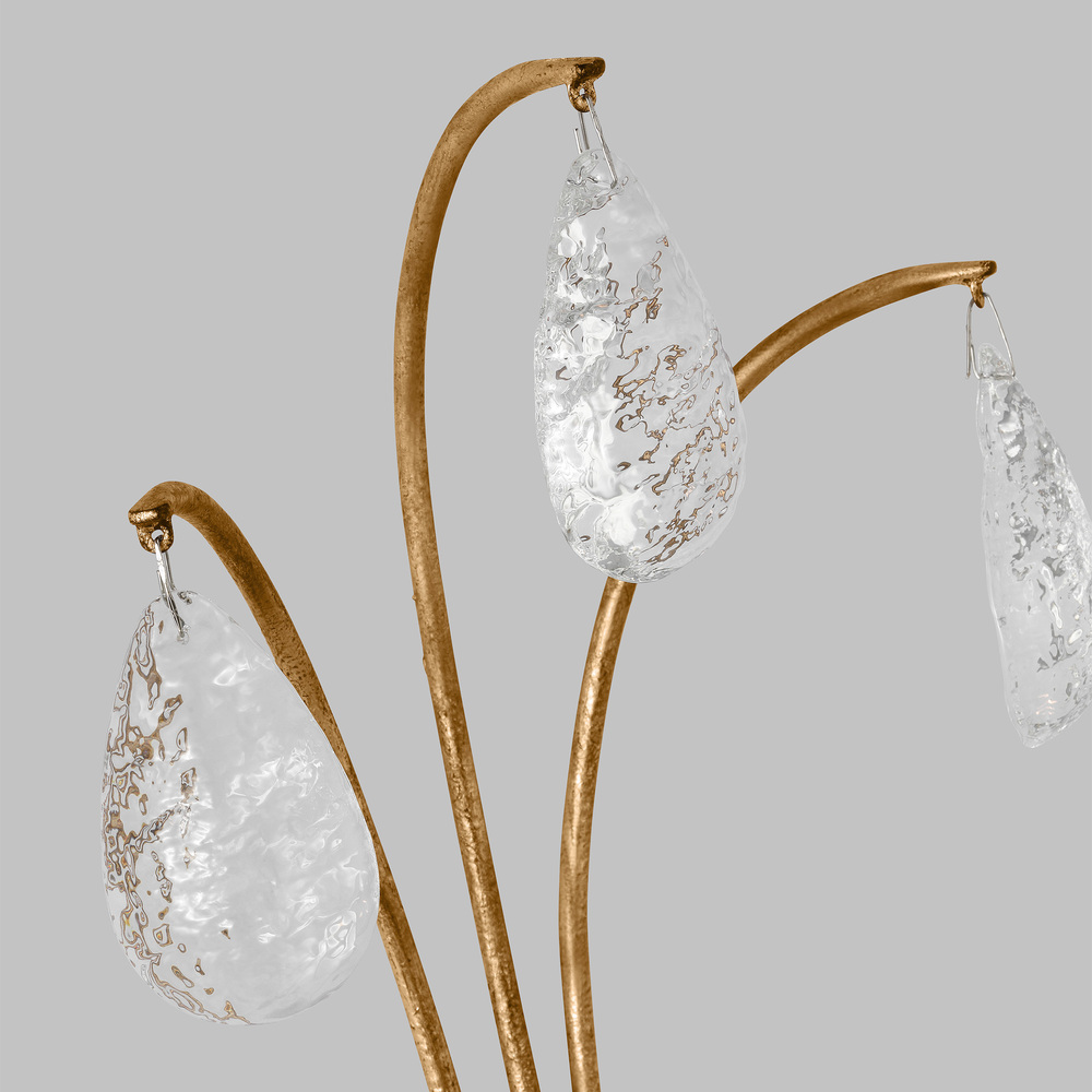 Two things inspired the Shannon two-light wall sconce in Antique Gild. The frame is based on a vintage chandelier from the Chapman design studio archives, and the glass drops were based on a cast glass vase with a beautiful rippled texture. The metal frame of the chandelier has a curved profile. The one end of each arm supports a light while a glass drop hangs from the other, and the metal arm curves up and around in one continuous visual length. The central hub has the same hourglass profile as the Westerly Chandelier. The signature detail of the design is the unique glass drops with an organic rippled texture that almost resembles melting ice and refracts the light beautifully.