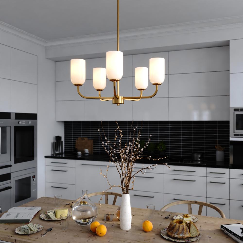 Illuminate your dining room, living room, or foyer with the Shelby 5 Light Chandelier. Its classic design and natural brass finish add a touch of timeless sophistication for both transitional and contemporary spaces. The elongated white dome-shaped glass shade emits a soft, diffused light, creating a warm and inviting atmosphere that's perfect for a cozy family dinner or a grand evening of entertaining.