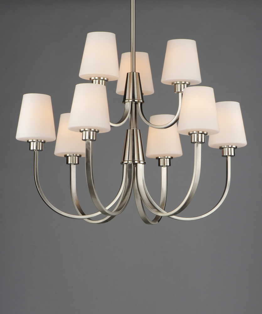 Graceful arcs of rectangular tubing transition to round cups that support tapered Satin White glass shades creating a crisp and clean transitional design. The frame is finished in your choice of Satin Nickel or Black which bridges modern and transitional d