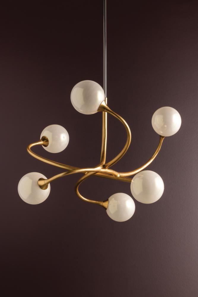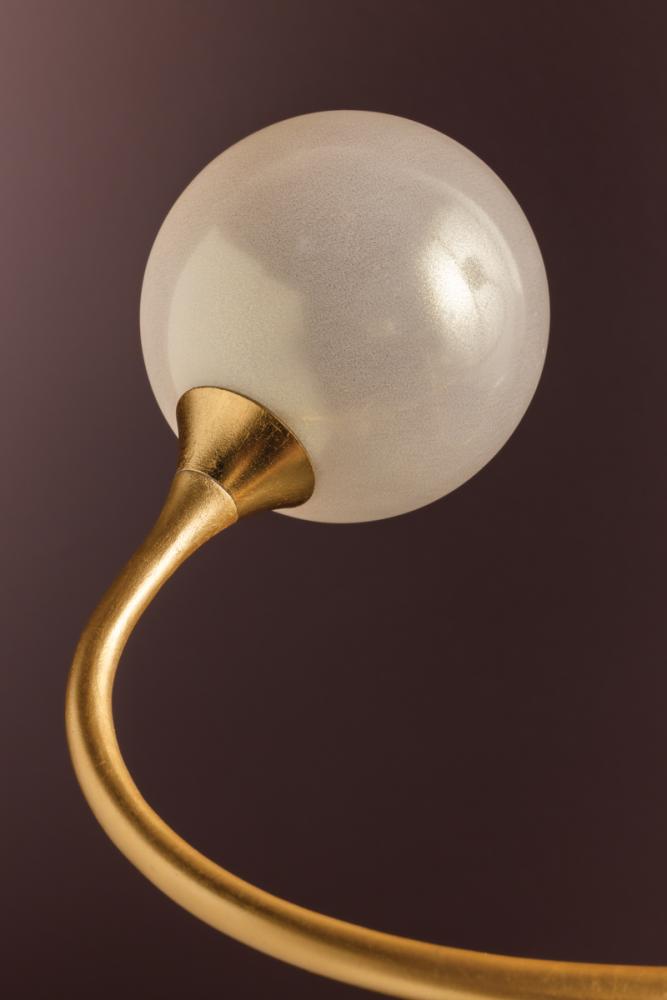 With its fluid silhouette and antique Gold Leaf finish, Signature offers a brilliant take on modern artisan effect. Delicately hand-crafted arms gracefully clutch white pearl-like shades, giving depth, beauty and texture to any space.