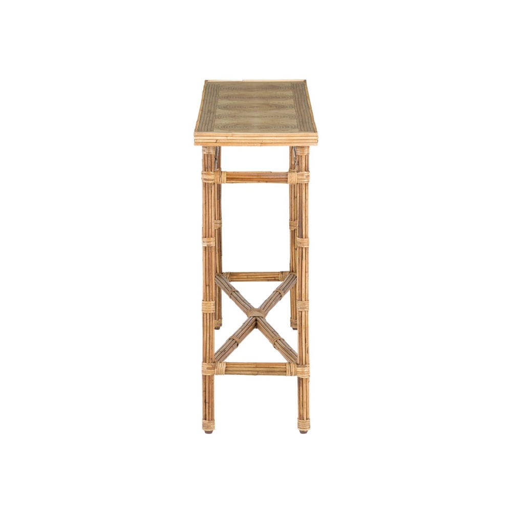 Our Silang Rattan Console Table is a rattan console table with a handmade geometric pattern on the top. Artisans painstakingly cut and fit the reeds in place to create this artful arrangement in the plant's warm hues. The material is protected by an inset glass top.