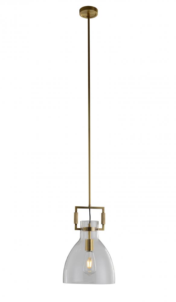 This exquisite single pendant lighting is in a brass finish. The frame is made out of metal, and it comes with a bell glass shade in clear color. The adjustable rod link makes this fixture suitable for most ceiling heights.