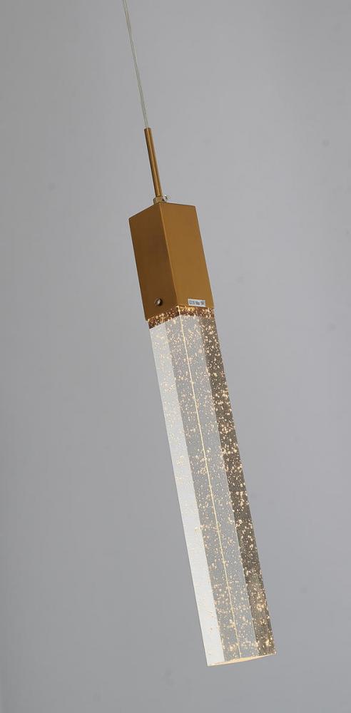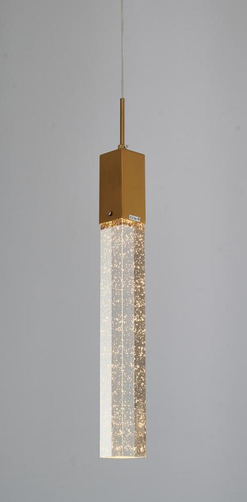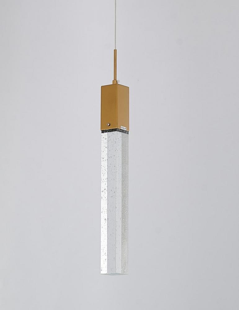 This exquisite single pendant lighting is in a gold finish. The frame is made out of metal, and it comes with a hanging clear bubble block crystal. The length of cords can be adjustable and make this fixture suitable for most ceiling heights