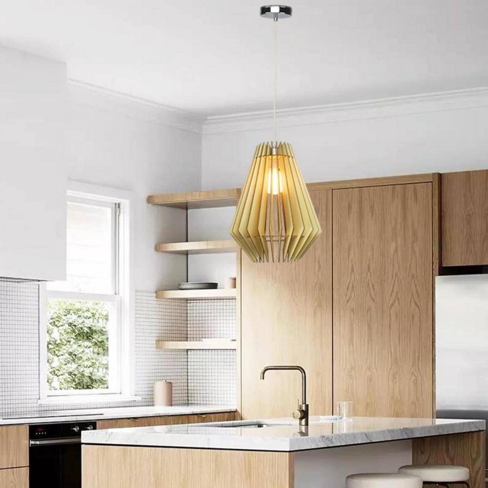 This exquisite ceiling fixture is in a natural wood finish. The frame is made out of wood. Install a pair of pendants in your entryway, or three over your kitchen island to create a cohesive look