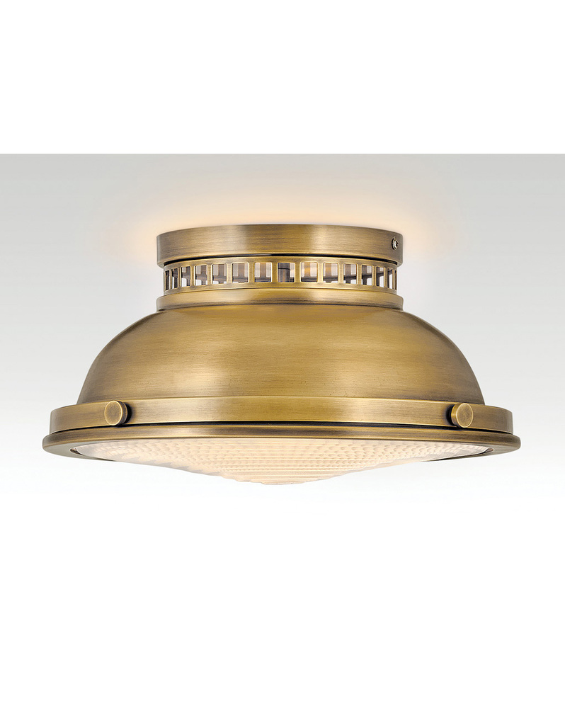 Inspired by vintage industrial lighting, Emery cuts a bold figure layered with unique details and robust finish options that include Polished Antique Nickel, Heritage Brass and Heritage Brass with Aged Zinc. Unique metal cutouts allow illumination to graze the ceiling while a functional down light is enclosed in heavy holophane glass, completing its authentic appearance.