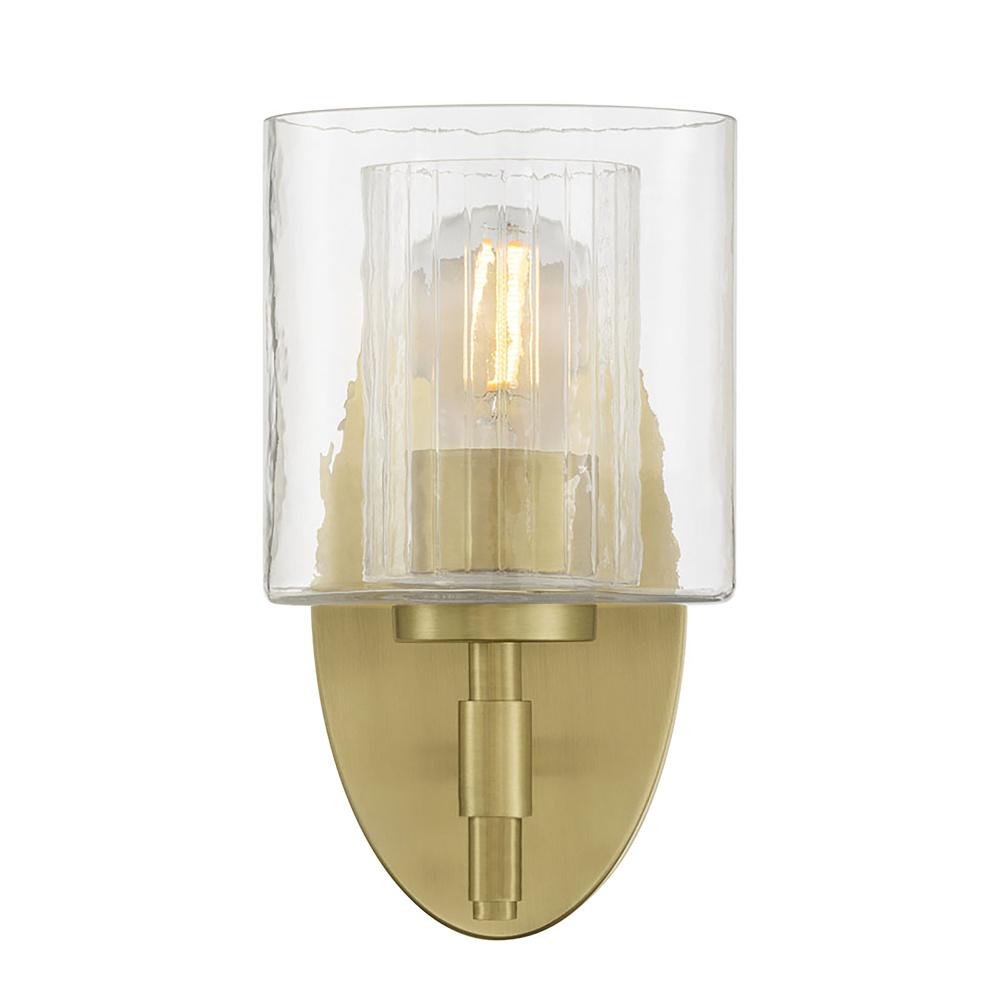 The brilliance of the Solventa Collection is evident in its design-forward double glass shade design. A clear ribbed glass shade is set into a vintage glass shade for a dazzling effect and ideal task light. The stunning fixture is a modern spin on vintage Victorian parlor lighting with a torch-inspired silhouette and cameo shaped backplate and is finished in either vintage brass or matte black.