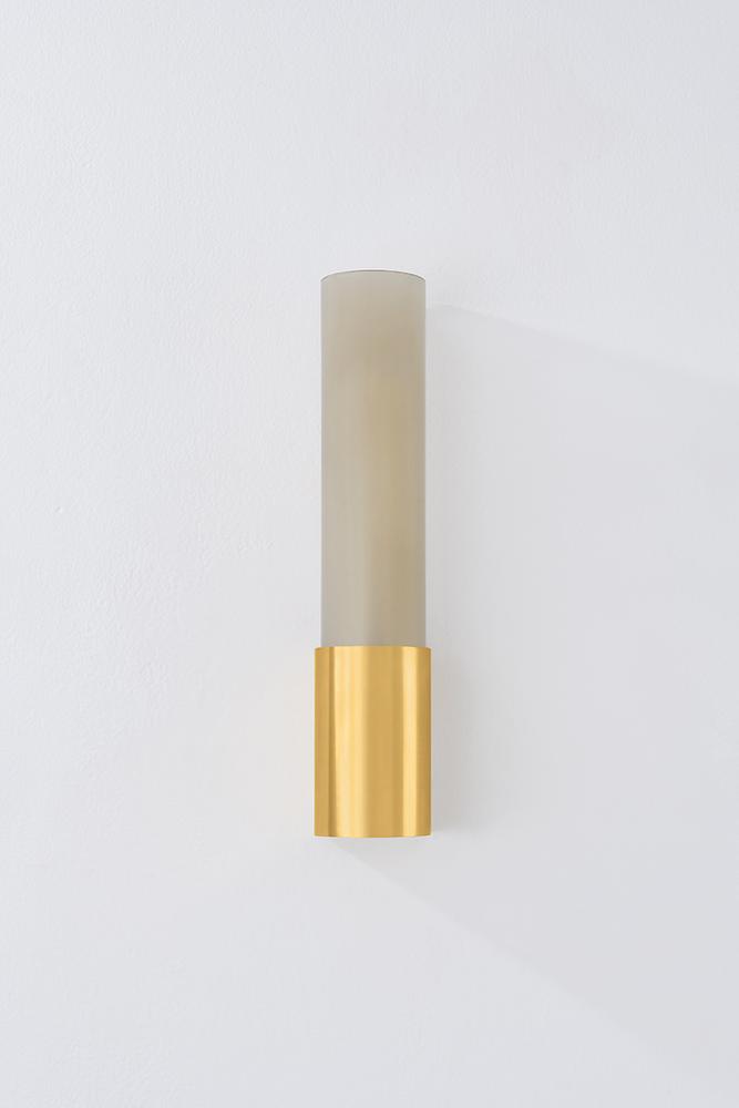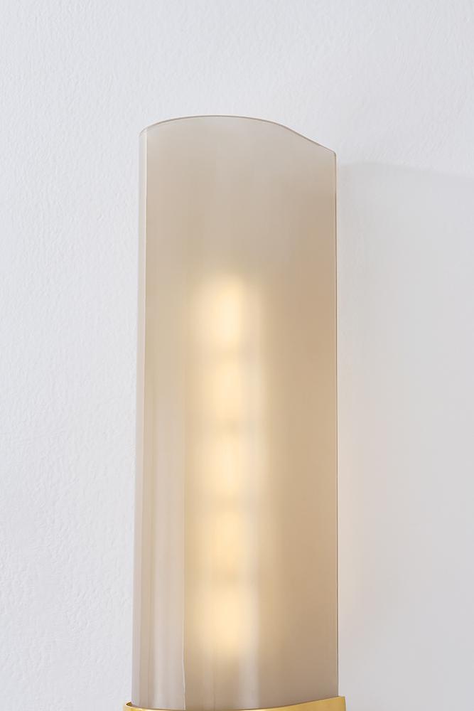 Melding bronze glass with sleek metalwork, the Somersville family includes two timeless, versatile sconces. Suited for a variety of small spaces, the bullnose shape of these fixtures creates a monolithic look. The light bronze glass is etched inside, creating a softly patinated appearance that conceals the light source. When illuminated, the Aged Brass finish of the metalwork glints off the glass shade.
