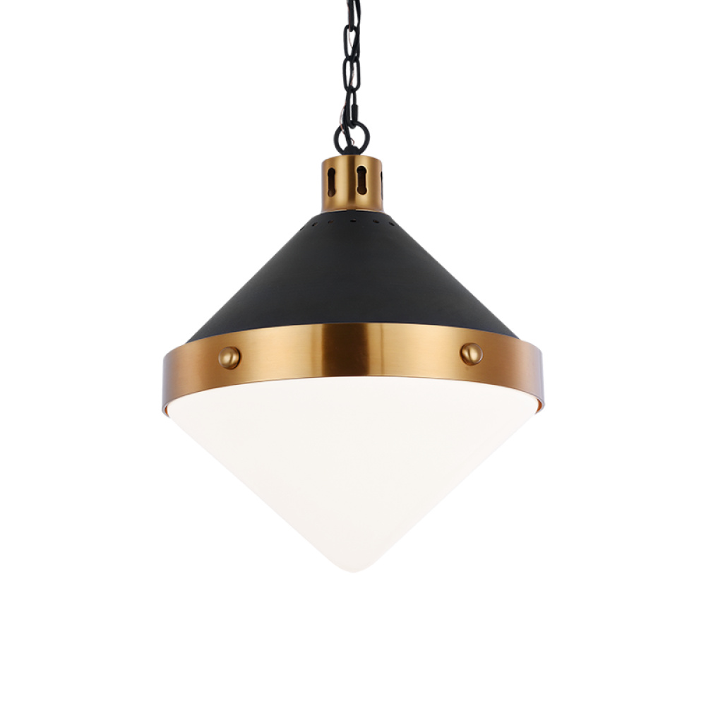 A fusion design that combines medieval style with modern elements. Sphericon is available in Matte Black with Aged Gold Brass or Matte Black with Chrome. Both colour options are complete with a clear glass shade or an opal glass shade. LIGHTBULBS NOT INCLUDED