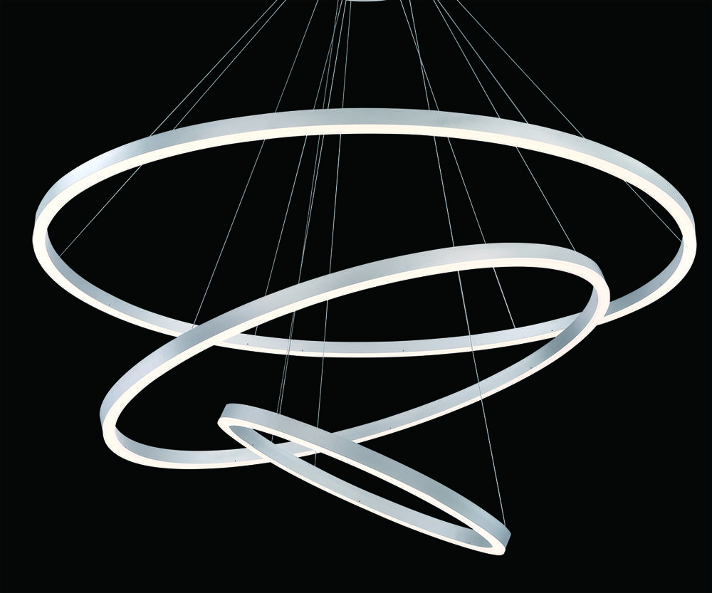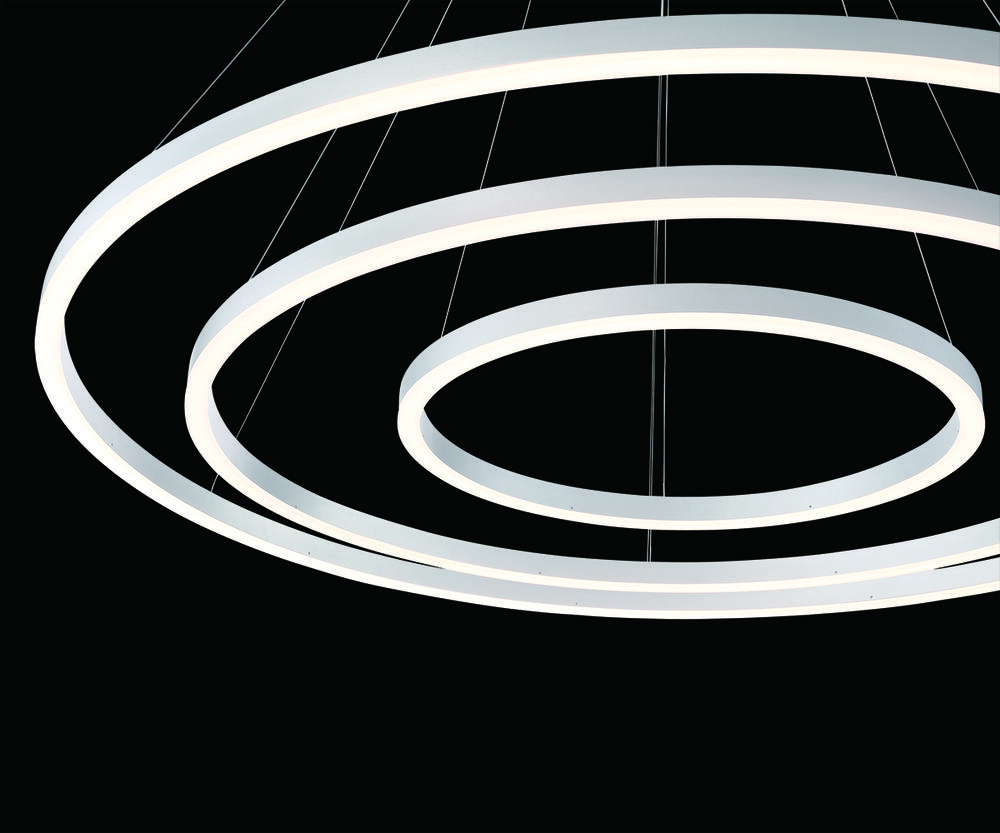 Oversized machined aluminum rings bring these simple chandeliers to life. The grand stature demands attention and illuminates large spaces with opal diffused LED lighting.
