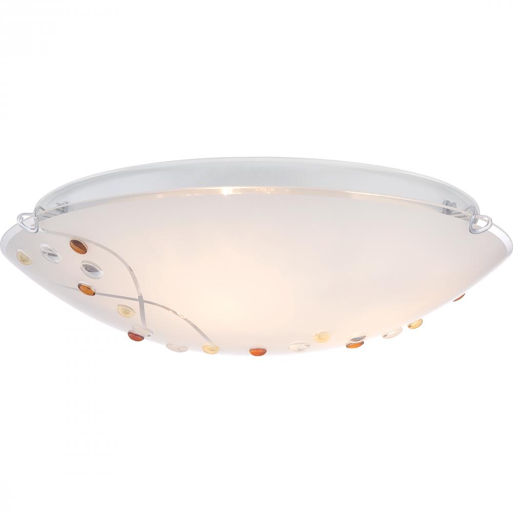 Stellar from the Quoizel Platinum Collection is a beautifully designed floating flush mount. The amber yellow and clear jewels on the shade bring life to the white painted glass and the intricate detail of the two clear swirling lines add a little twin