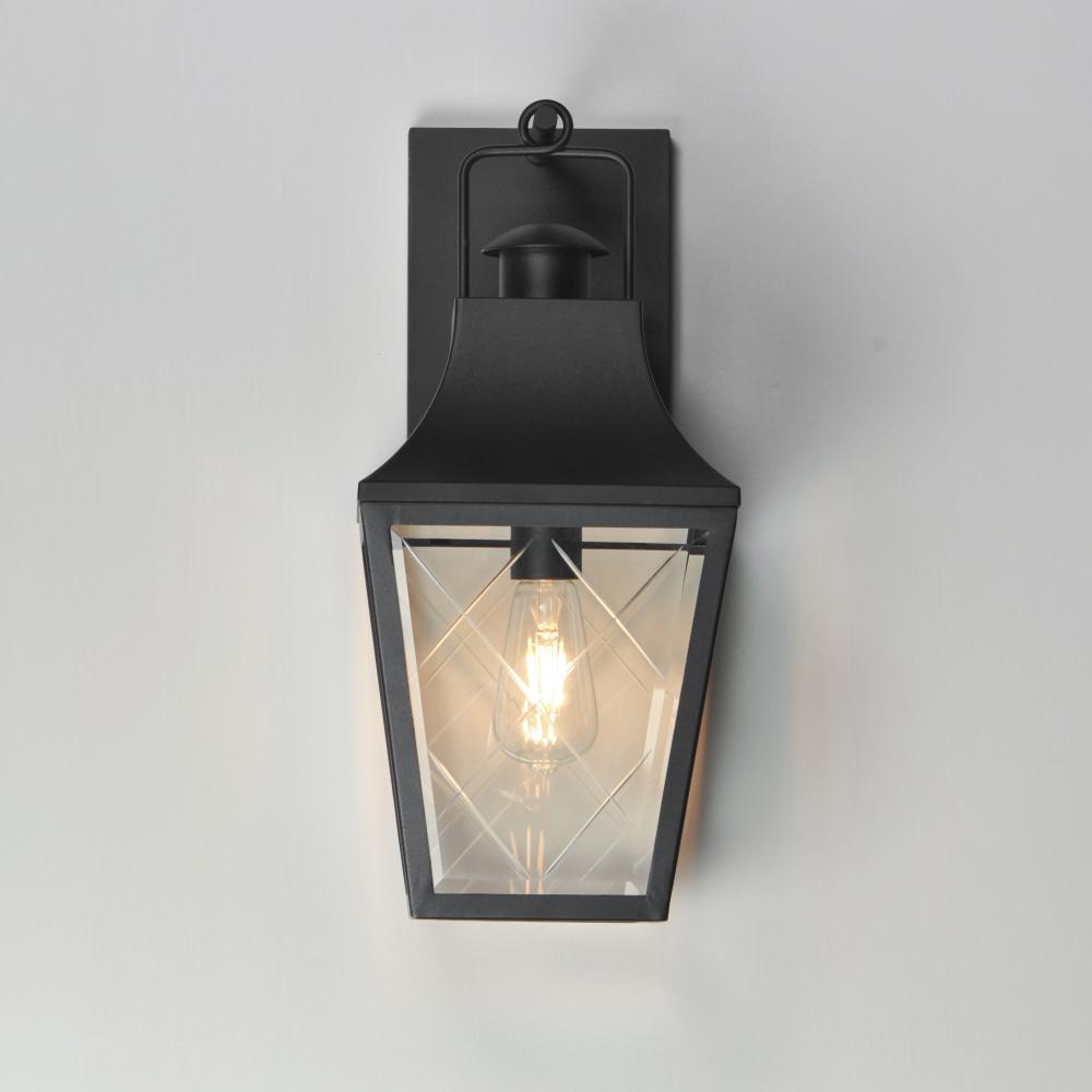 These charming cottage style lanterns feature unique cross-etched glass panels that are Clear and beveled along their edges. Additional design details such as whimsical loops above a chimney element add to the product's delightful appearance. Finished