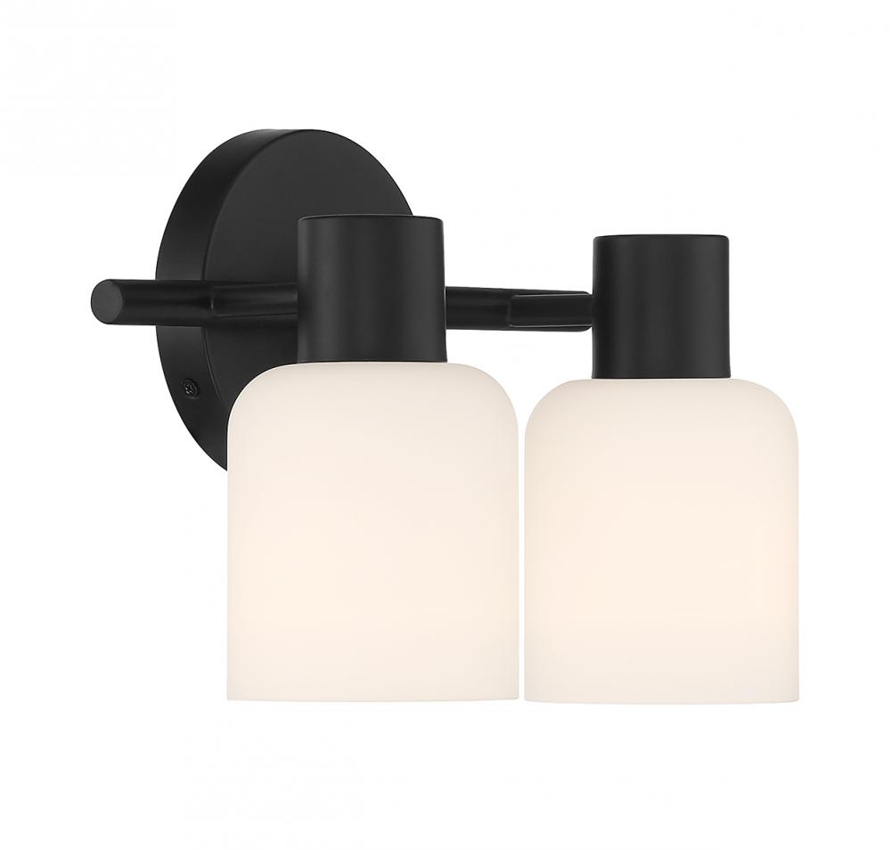 This Strand 2-light bath vanity light has a crisp, clean, modern look that is ideal for stylish homes. White glass shades ensure a comfortable and even glow. Matte black finish. Strand is 8" in height, 10.25" in width and extends 6.25" from the wall. It uses 2 standard size bulbs of up to 60 watts per bulb (bulbs not included).