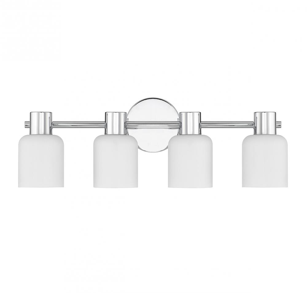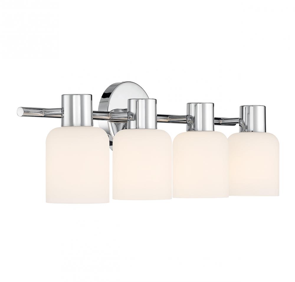 This Strand 4-light bath vanity light has a crisp, clean, modern look that is ideal for stylish homes. White glass shades ensure a comfortable and even glow. Chrome finish. Strand is 8" in height, 23.25" in width and extends 6.25" from the wall. It uses 4 standard size bulbs of up to 60 watts per bulb (bulbs not included).