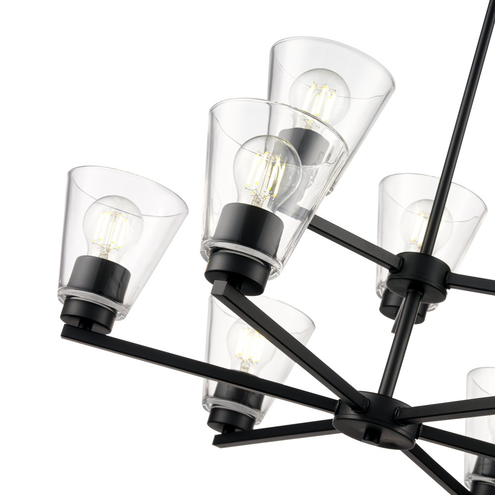 Perfectly flared crystal-clear glass shades framed against streamlined fixtures set a unique design tone for the Strayhan Family of interior lighting. Perfect for illuminating any location from the entryway on throughout the entire home, these fixtures are available as a 1-light sconce, 1-light pendant, 2-light flushmount; 1, 2, 3 and 4-light vanity; and 3, 5, and 9-light chandelier. Finished in matte black, brushed nickel, or modern gold, these understated fixtures infuse a cosmopolitan design sense into any interior space.