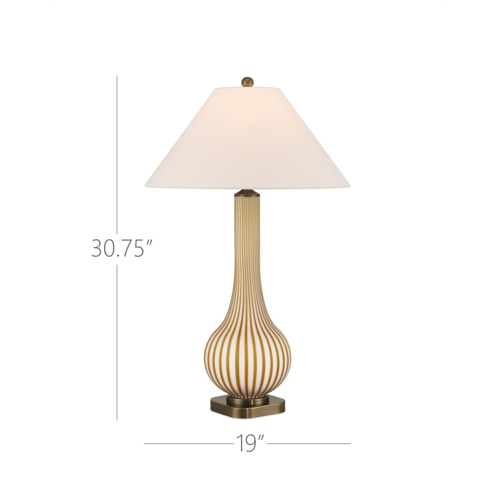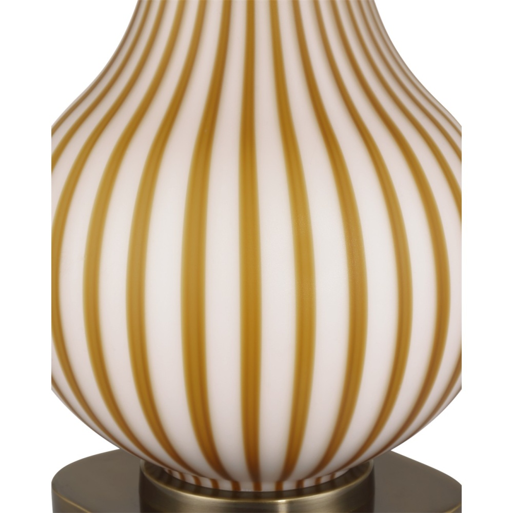The Striae Table Lamp was created during a meticulous two-step glassmaking process in which evenly spaced ochre glass rods are fused onto a white milk-glass body to create a striated pattern. The flared empire shade echoes the lamp’s pale tones while the antique brass base and finial draw out the rich ochres. The design, which was inspired by an Italian fixture, is very difficult to achieve with such uniformity.