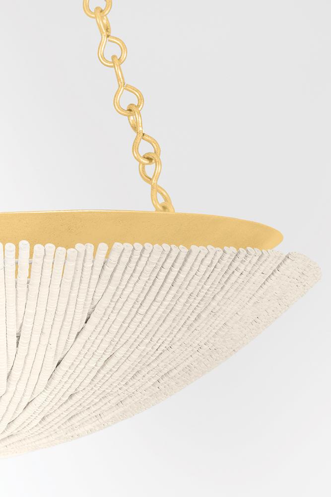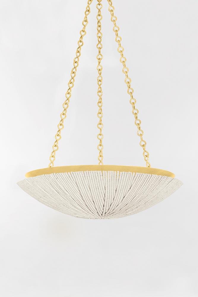 The sophisticated silhouette, ornate details, and mixed materiality of Summerside make for a truly majestic pendant light. The beautiful Coco Shell bowl on this fixture has been hand-beaded, creating a rich texture and visual dynamism. Stacked within this bowl, a Vintage Gold Leaf dish reflects light outwards, adding a tasteful material contrast. Available with 4 or 6 lights. Due to the one-of-a-kind nature of the medium, exact colors and patterns may vary slightly from the image shown.