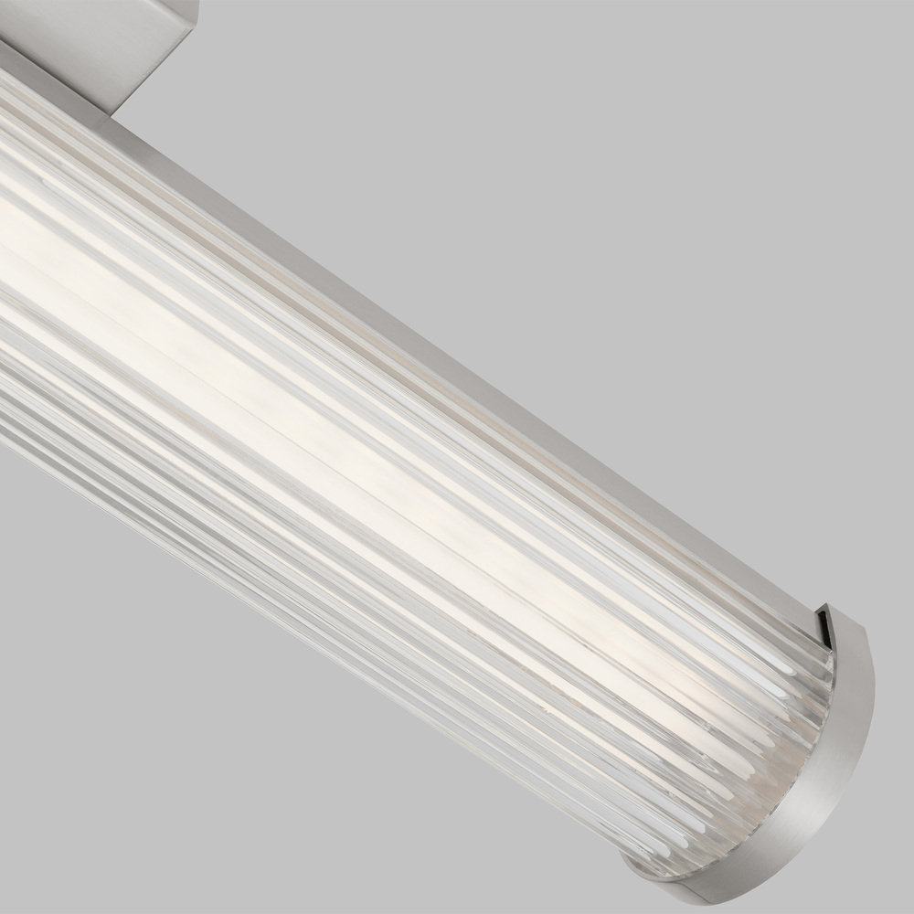 Syden is crafted of steel with clean-lined backplate and ridged glass shade. This understated detailing makes for a versatile design, at home in either modern, transitional or traditional interiors. Syden can be mounted horizontal or vertical.
