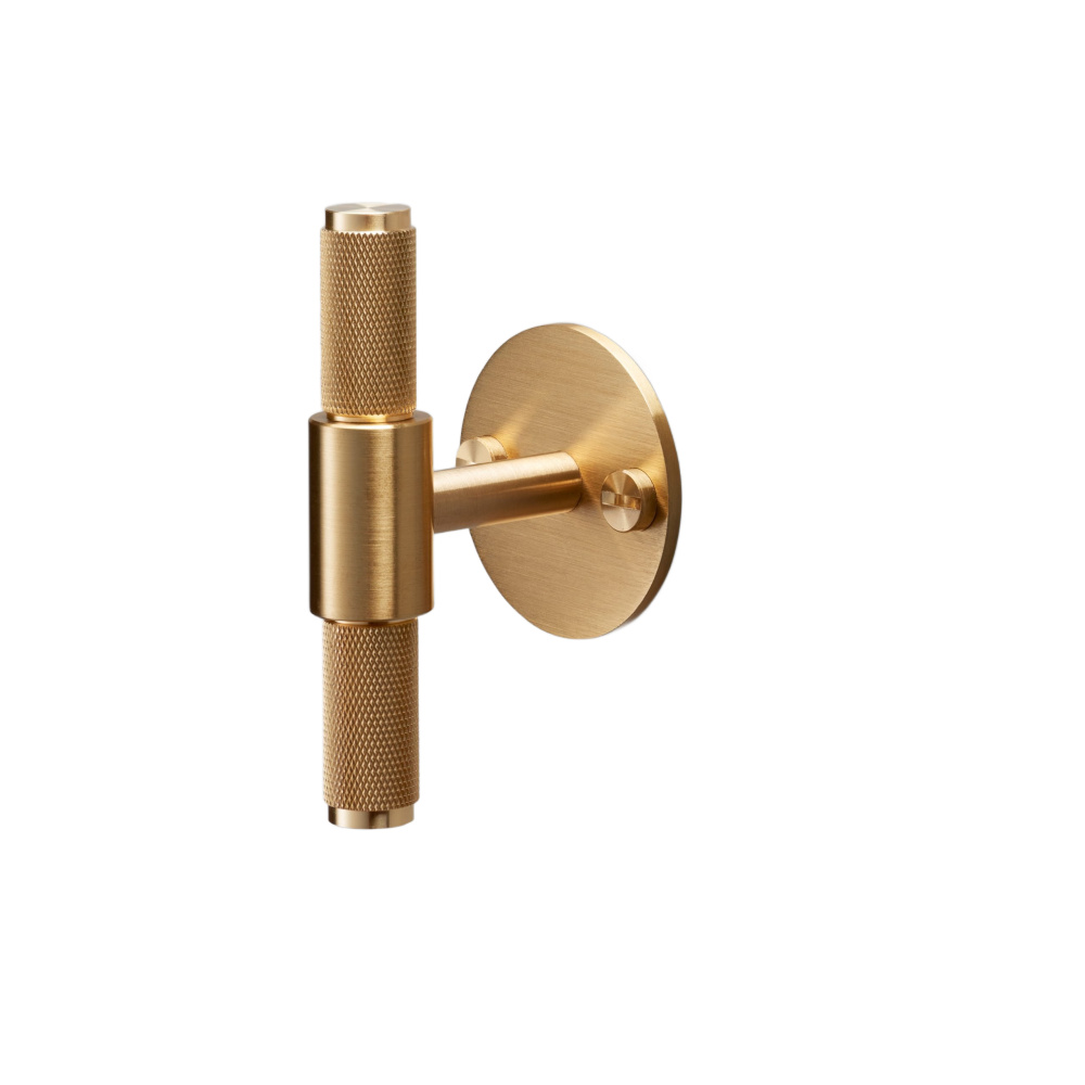 A T-bar made from solid brass. This T-bar features our signature, diamond-cut, cross-knurl pattern. It comes complete with a solid brass circular backplate and is fixed with brass coin screws. They work great on cabinet doors, cupboards, kitchen units and just about anything that can open.
