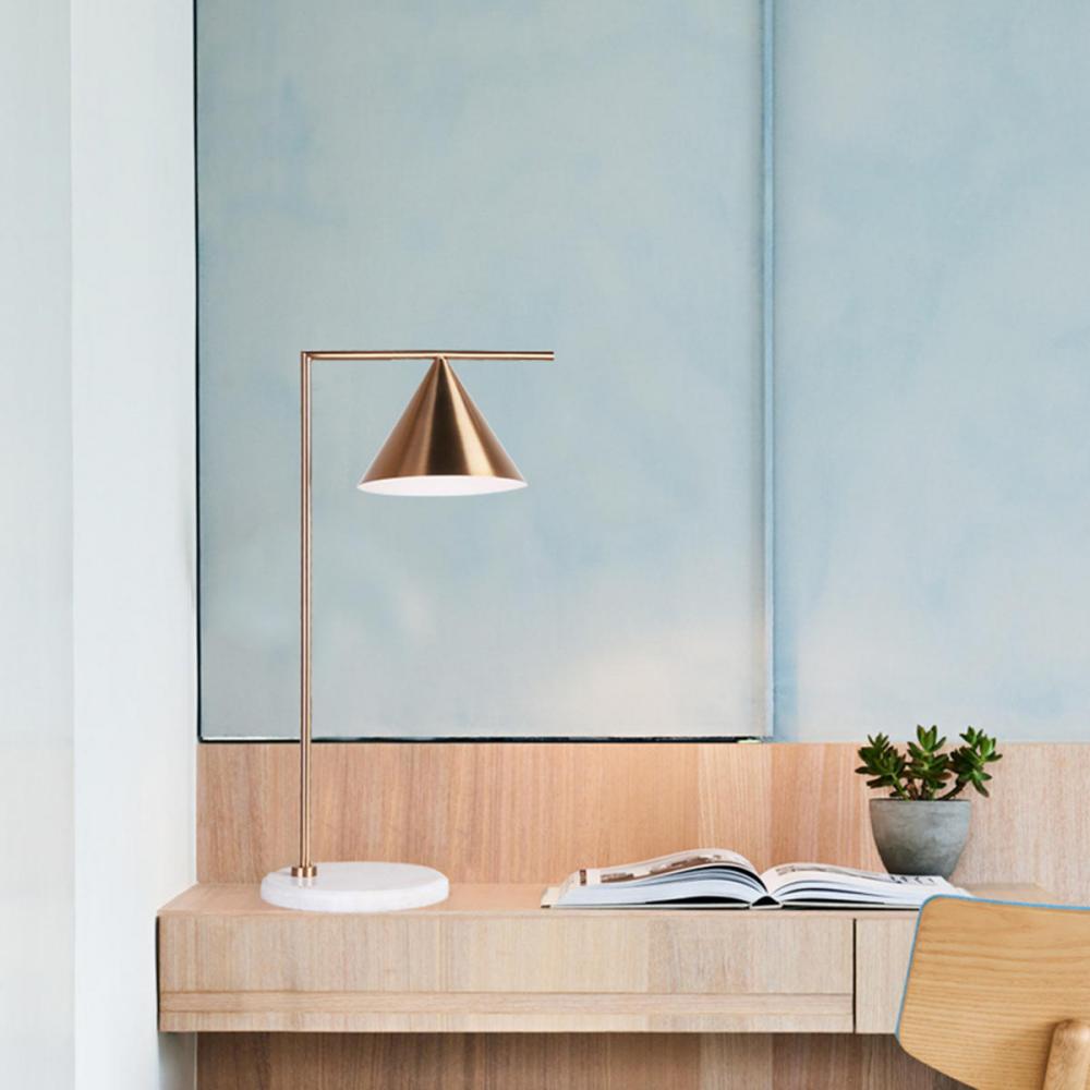 This exquisite is in a gold finish with a metal shade in gold color. The base is made out of marble in white color. It is great for chair side reading or general room illumination.