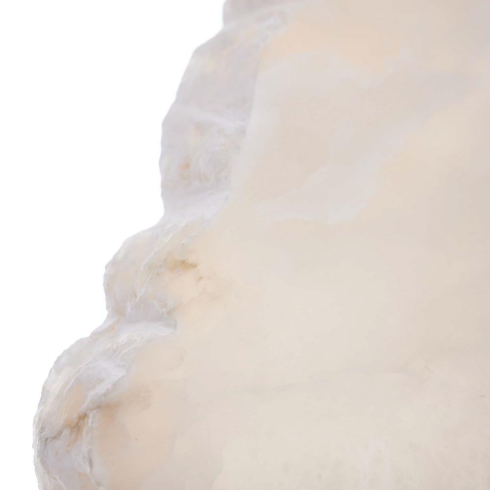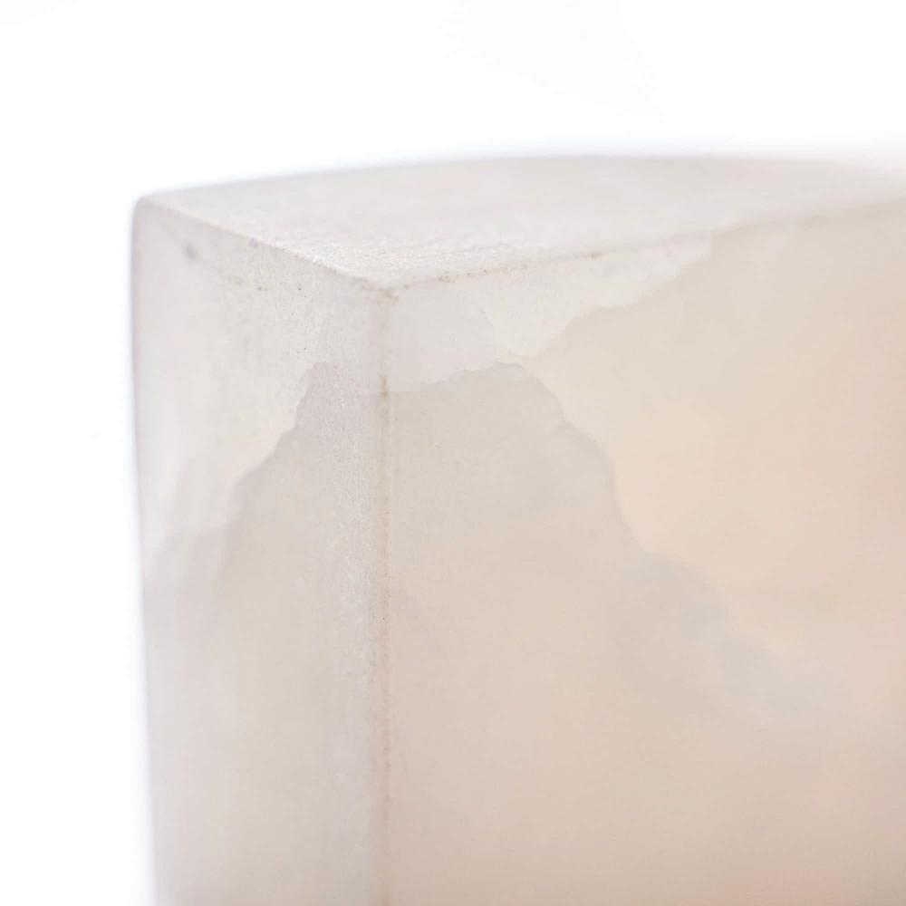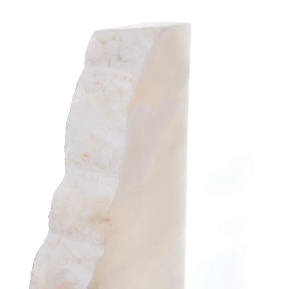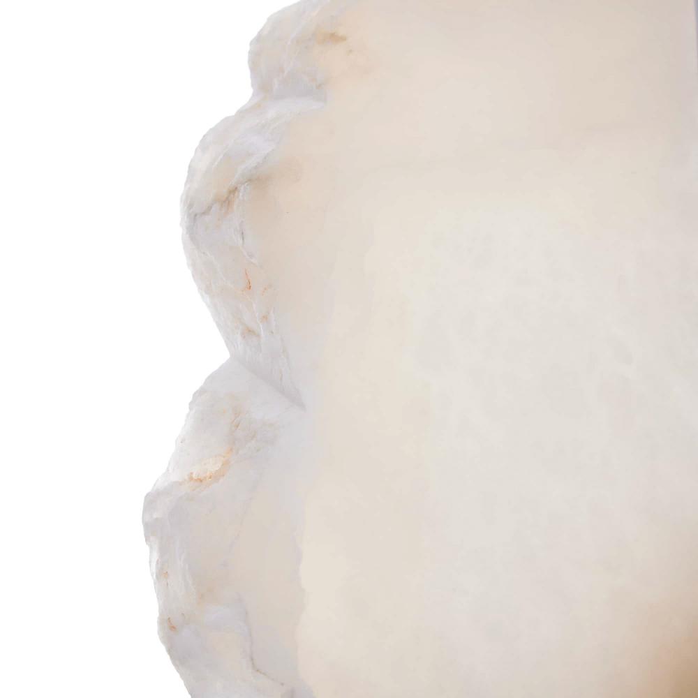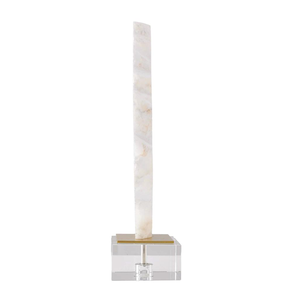 DRAWING INSPIRATION FROM 20TH CENTURY MODERNISM, THE TAOS SCULPTURE IS CHISELED FROM WHITE ALABASTER TO REVEAL A CRAGGY, RAW EDGE ON ONE SIDE AND A SMOOTH, VERTICAL PLANE ON THE OTHER. A ANTIQUE BRASS STEEL PLATE TOPS THE TRANSLUCENT CRYSTAL BASE. FINISH WILL VARY.